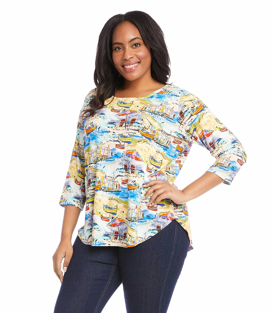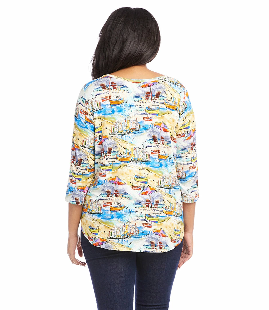 A vacation-ready print adds eye-catching appeal to this jersey-knit top. Pack this top for your next weekend getaway.