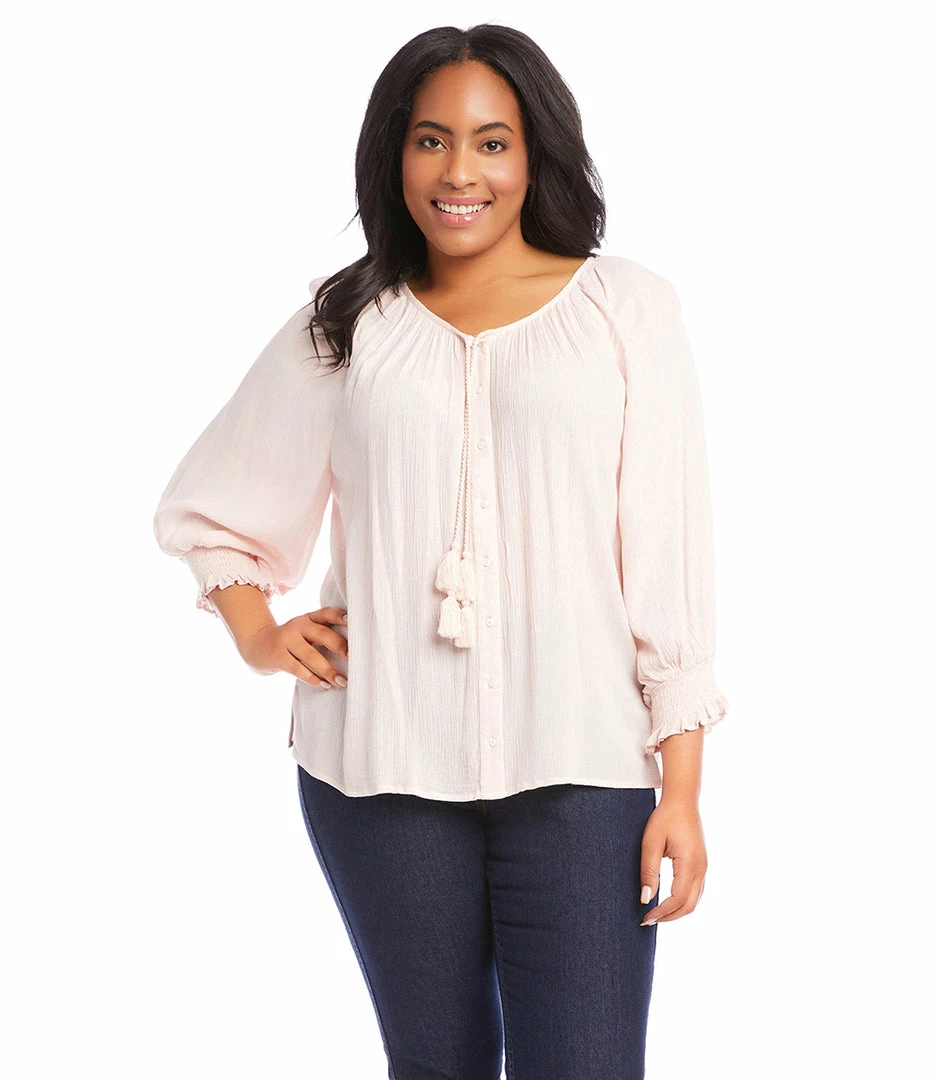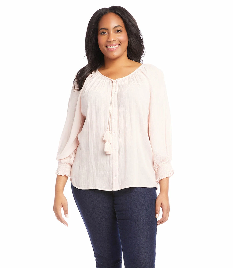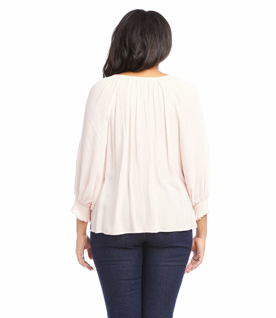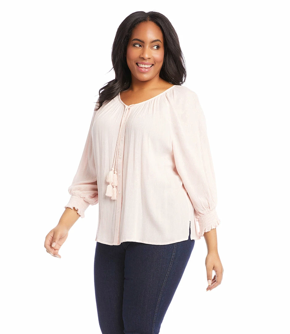 A classic peasant top constructed with airy textured gauze and finished with a tassel neck tie and smocked sleeves.