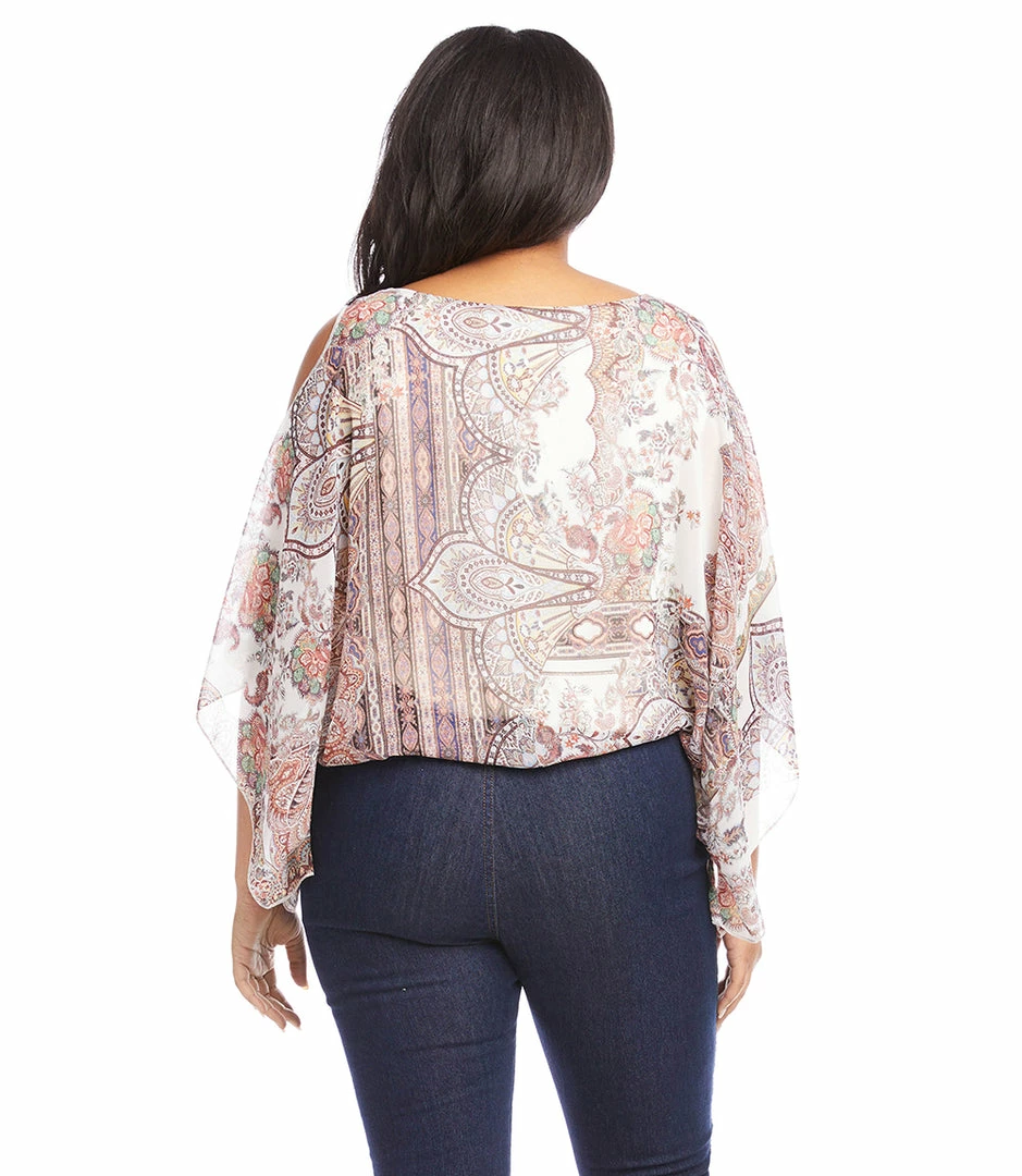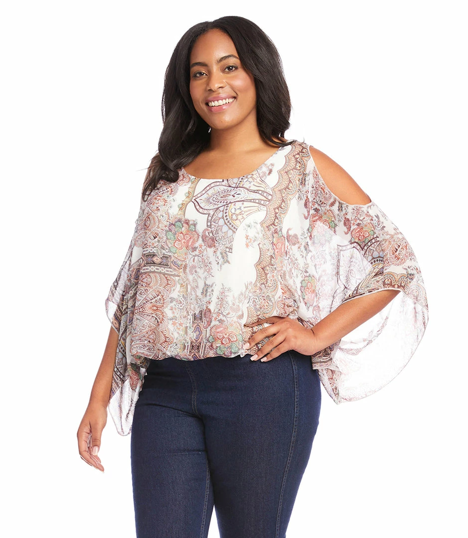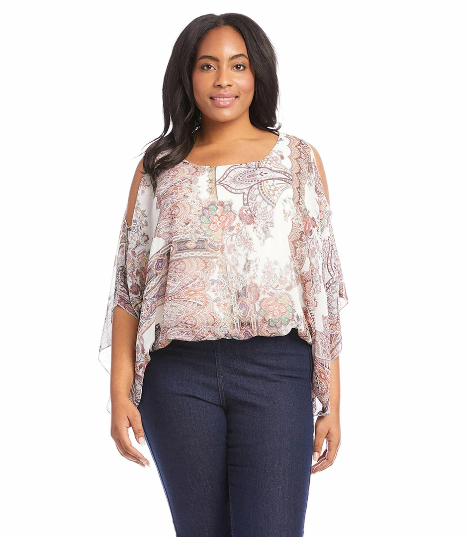 A breezy top with a softly wandering paisley print. This dreamy top features a flattering silhouette with an elastic bottom and built-in jersey knit lining.