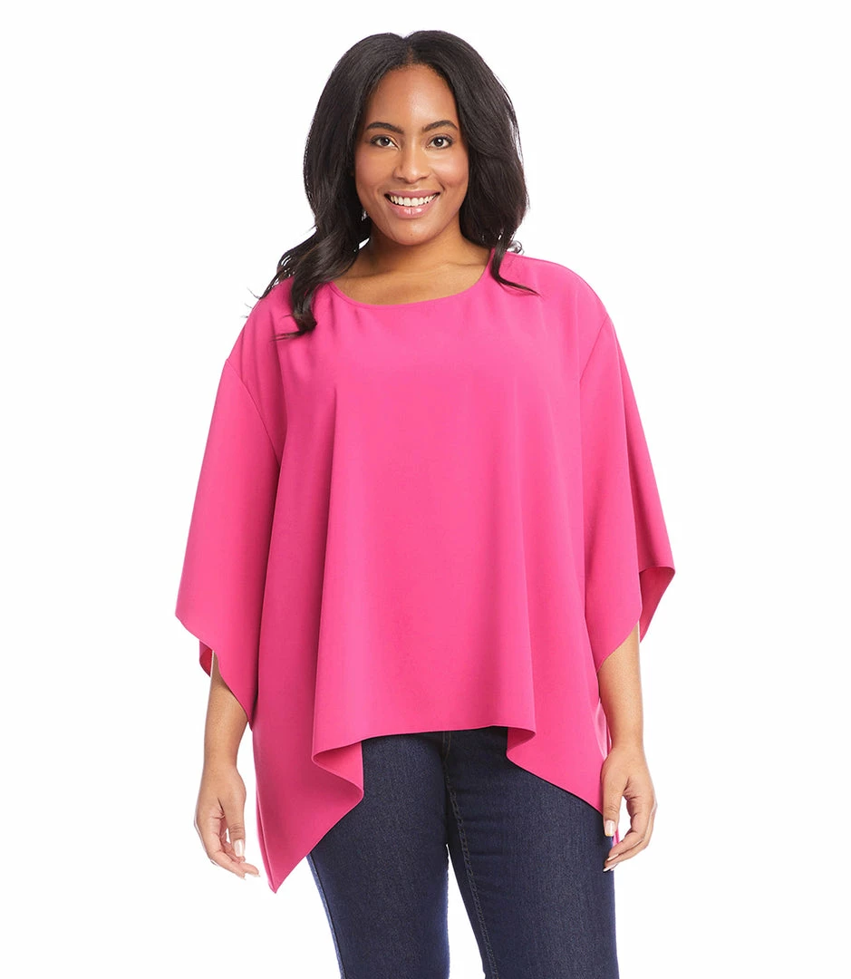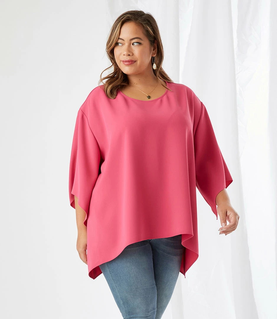 Cut from satin back crepe, this breezy top offers a billowy flare hem for soft movement.