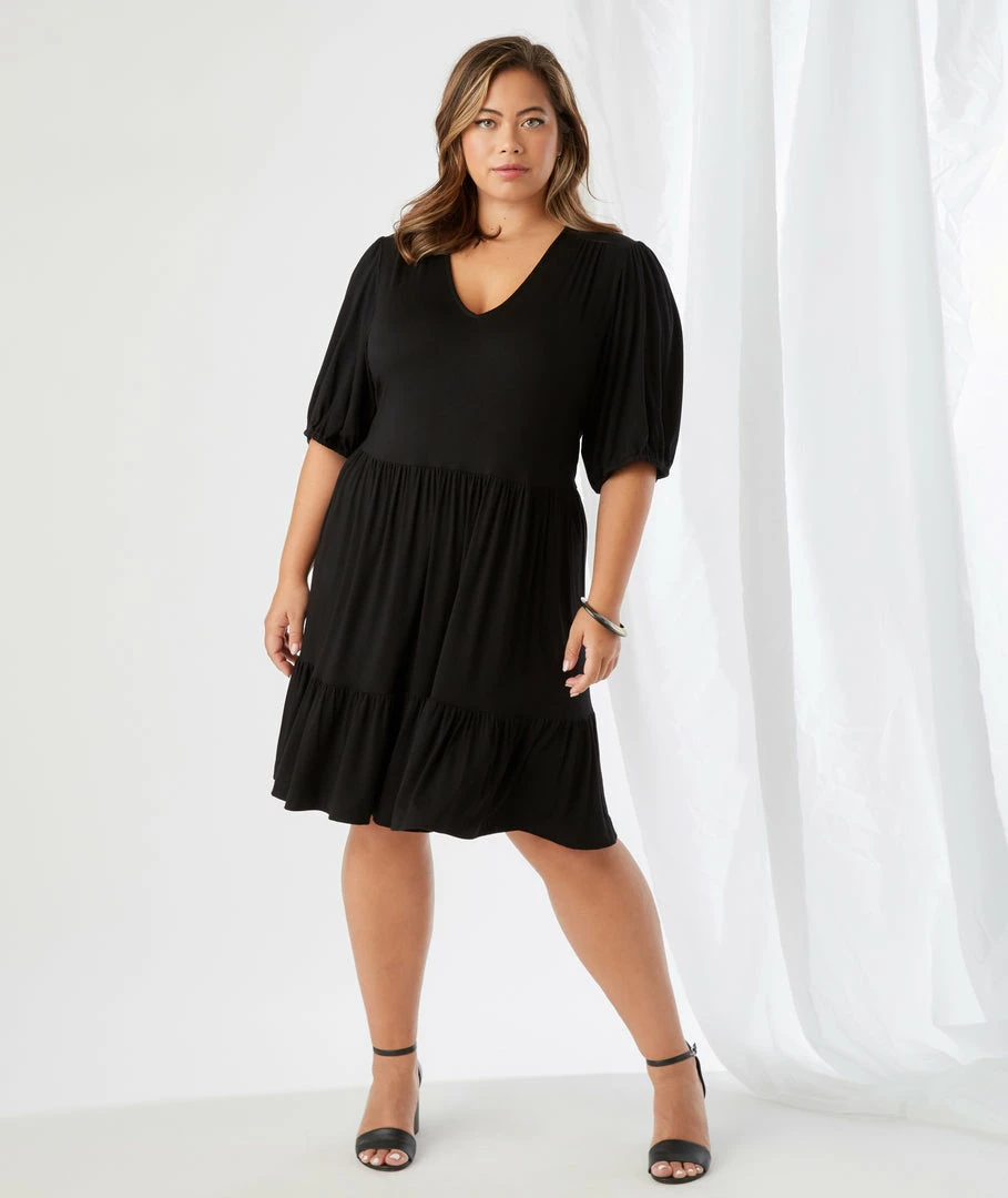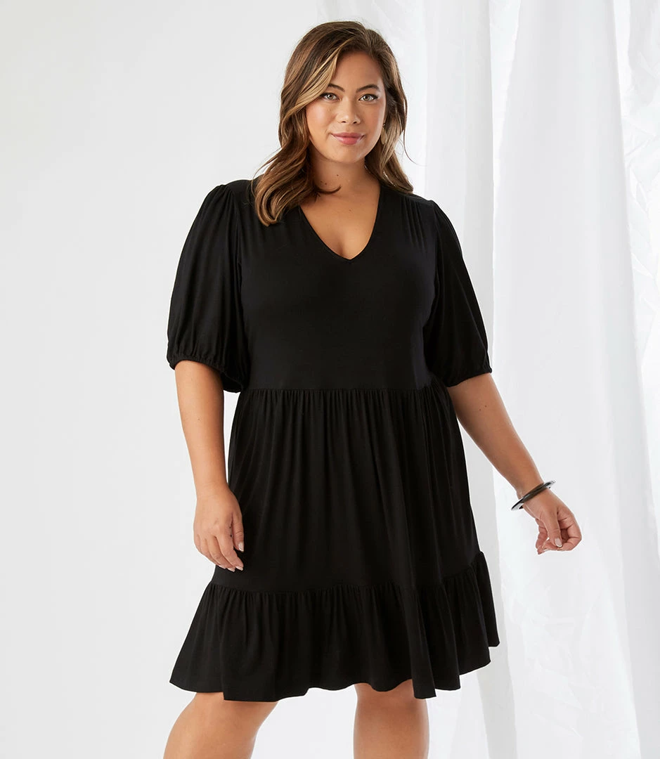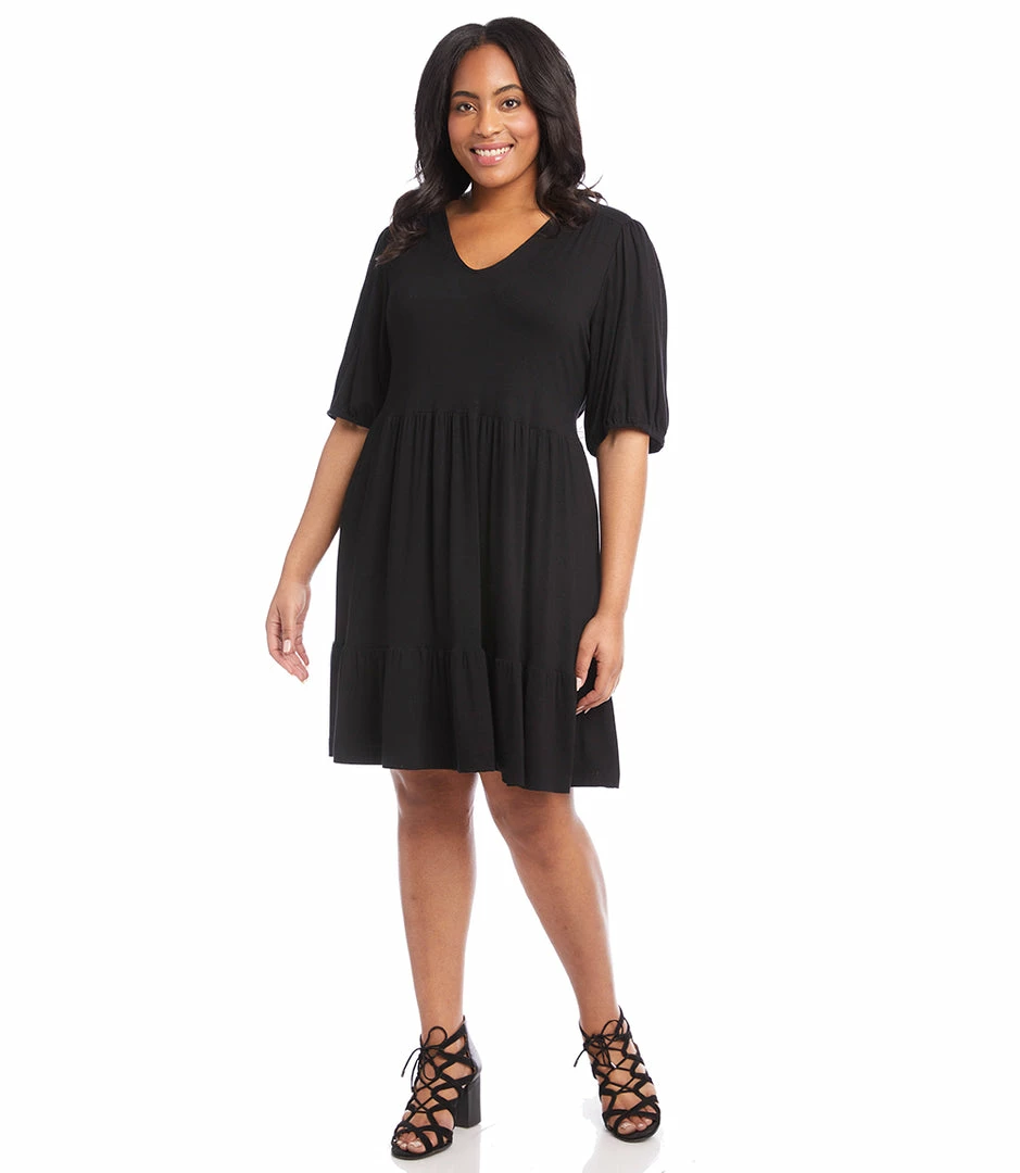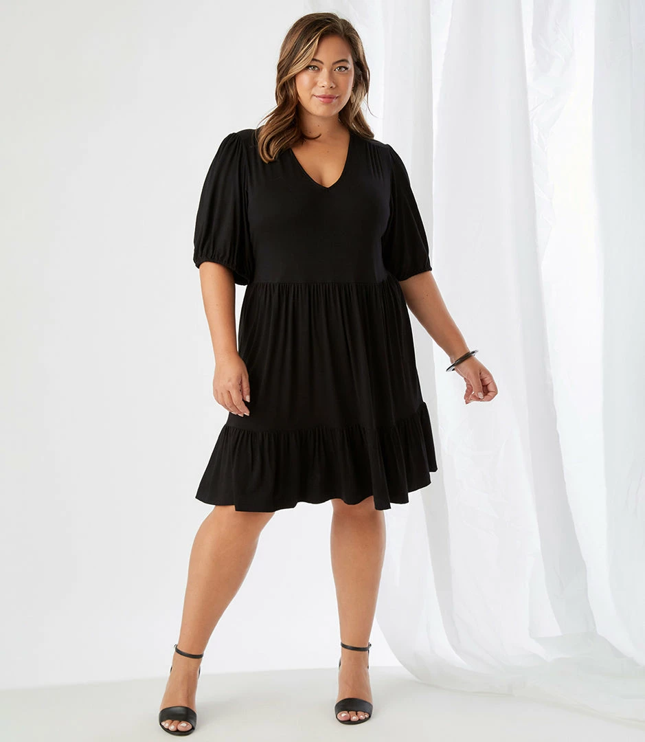 A figure-flattering dress that was designed to be an effortless choice for everyday wear. Puff sleeves and a tiered hem complete the look of this feminine and casual style.