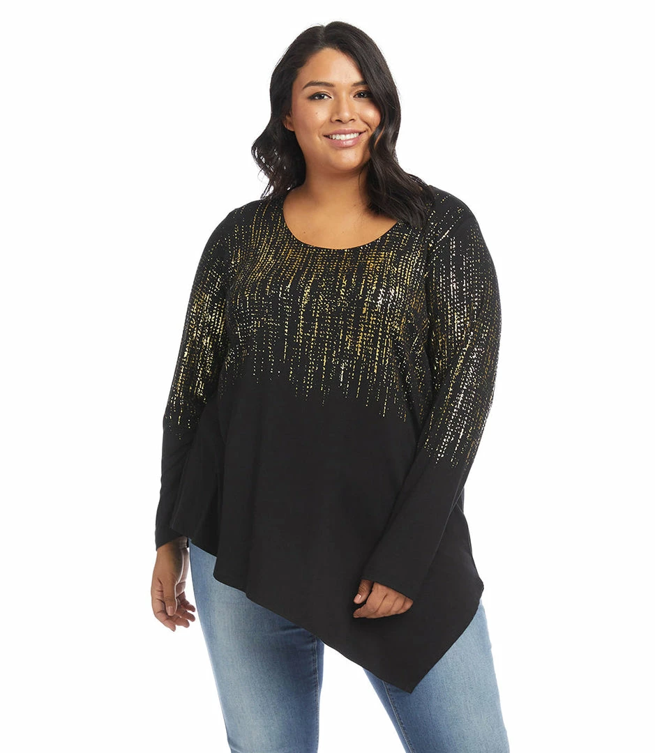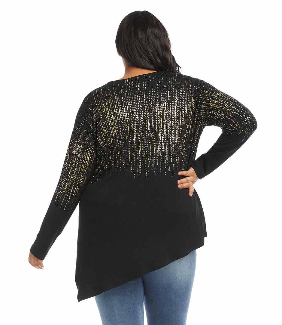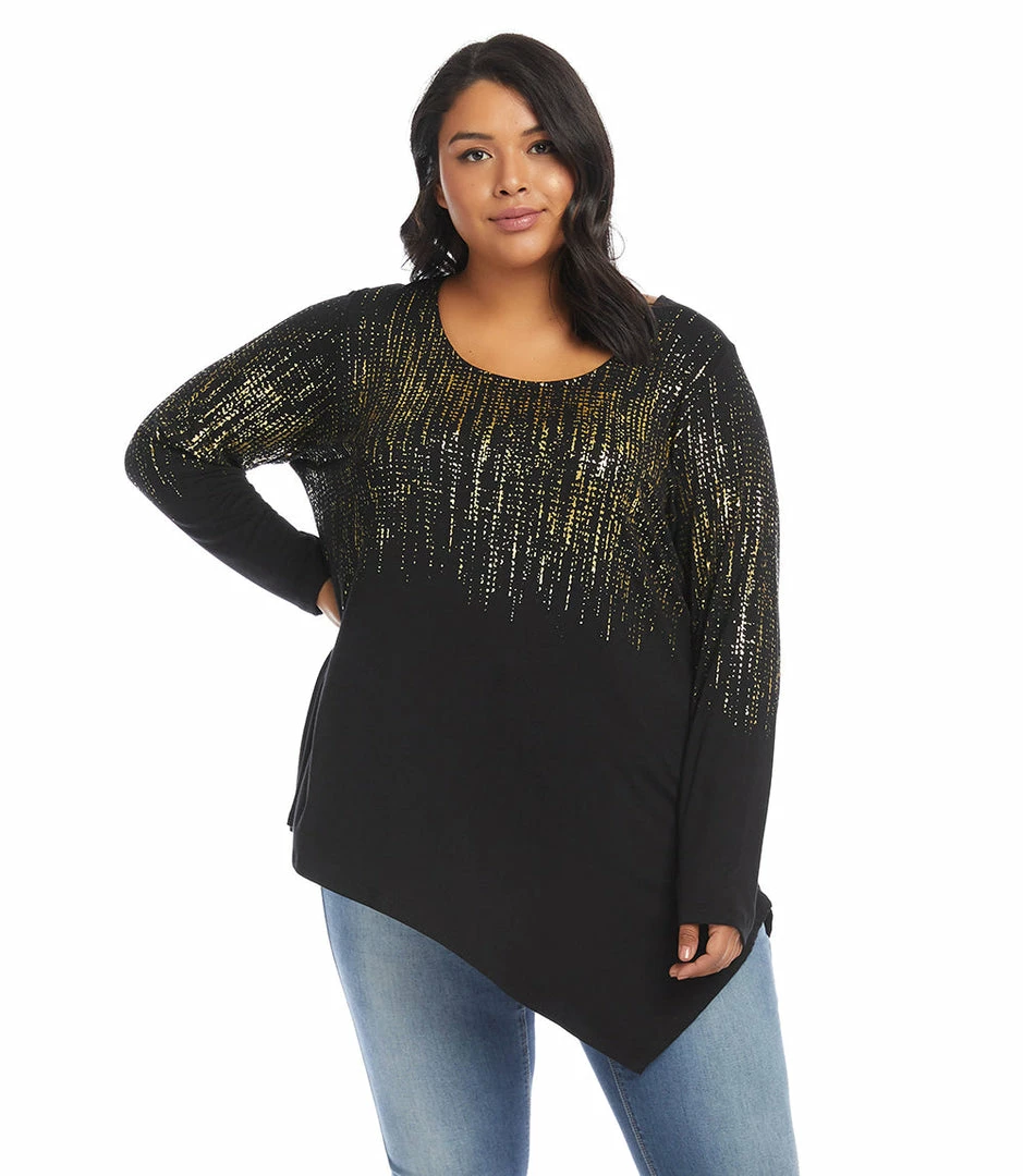 This standout jersey-knit top sparkles with a shimmering metallic print that fades out in an ombre effect. It features a modern asymmetric hem.