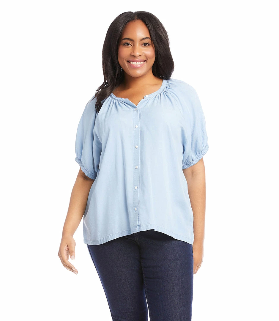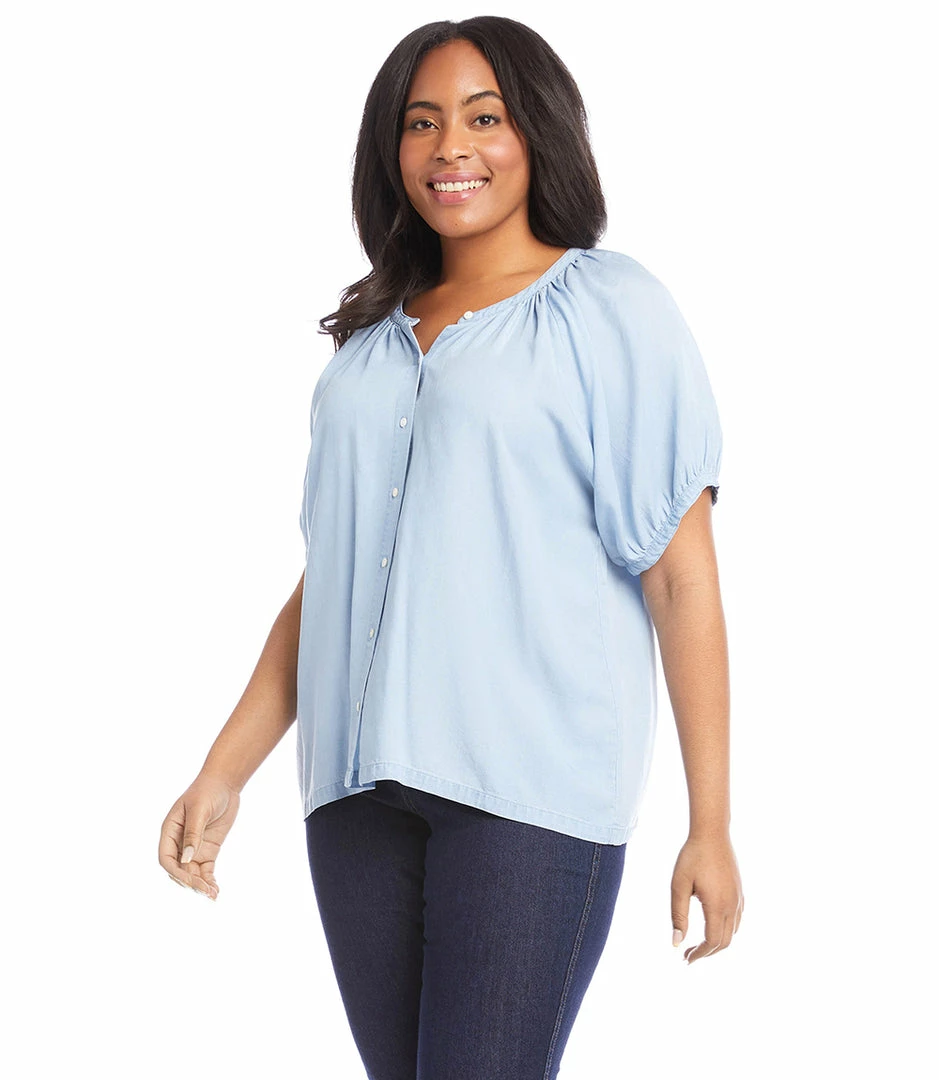 Puffed shoulders and a button-front peasant silhouette lend feminine flair to this breezy chambray top. Pair it with high-waisted jeans or tailored shorts—its outfit possibilities are endless.
