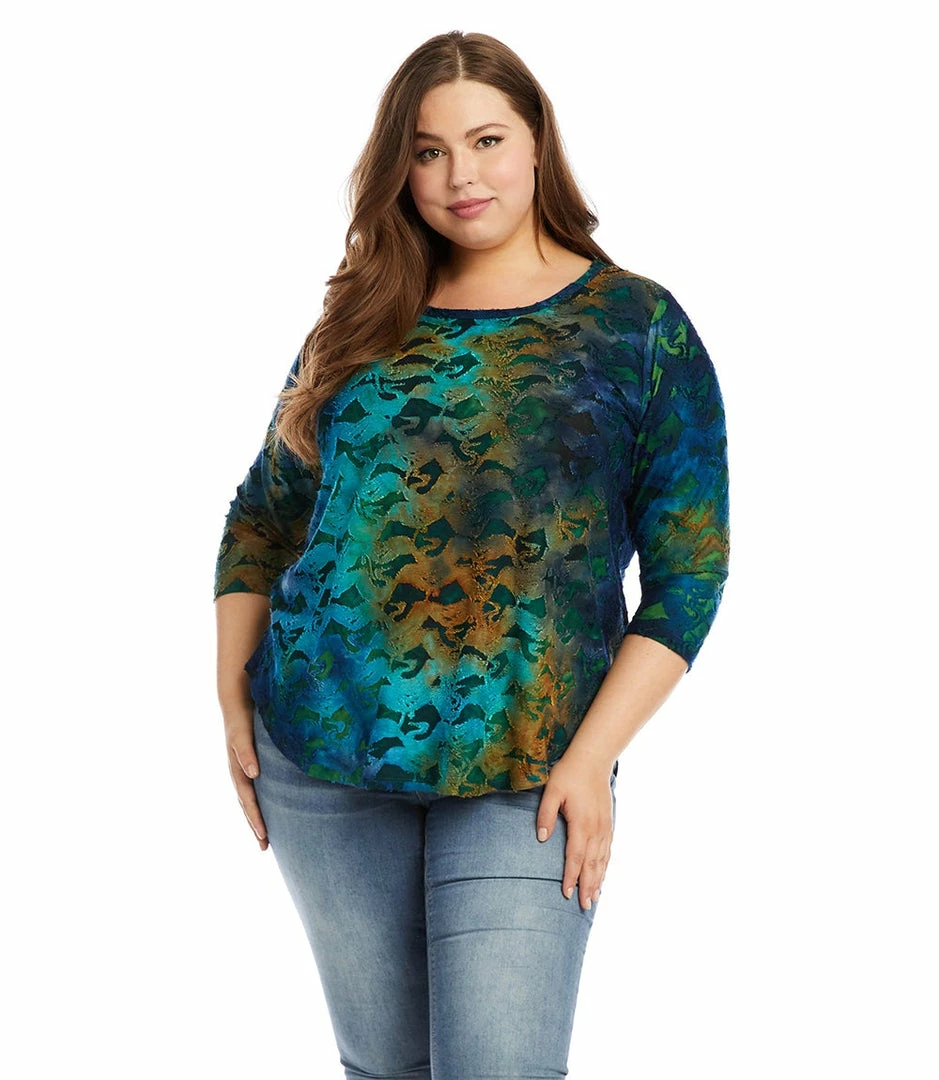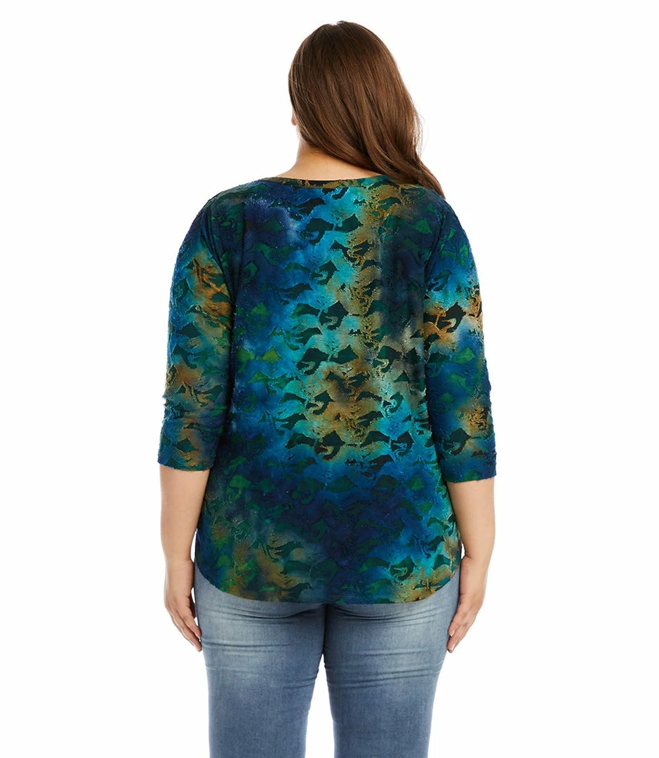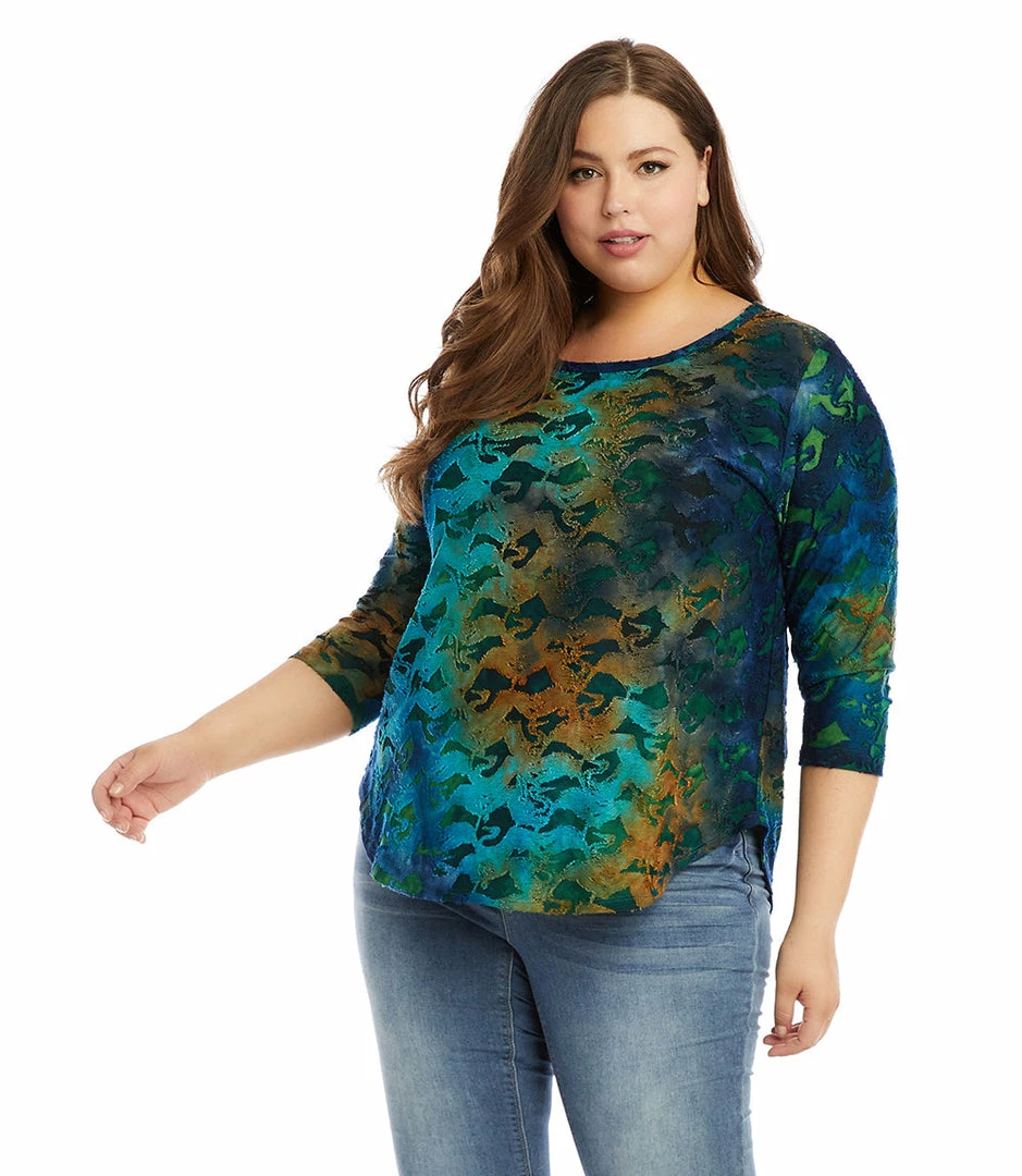 Textural beauty is found in this jacquard top covered in an alluring wave tie-dye design. It pairs perfectly with your favorite denim.