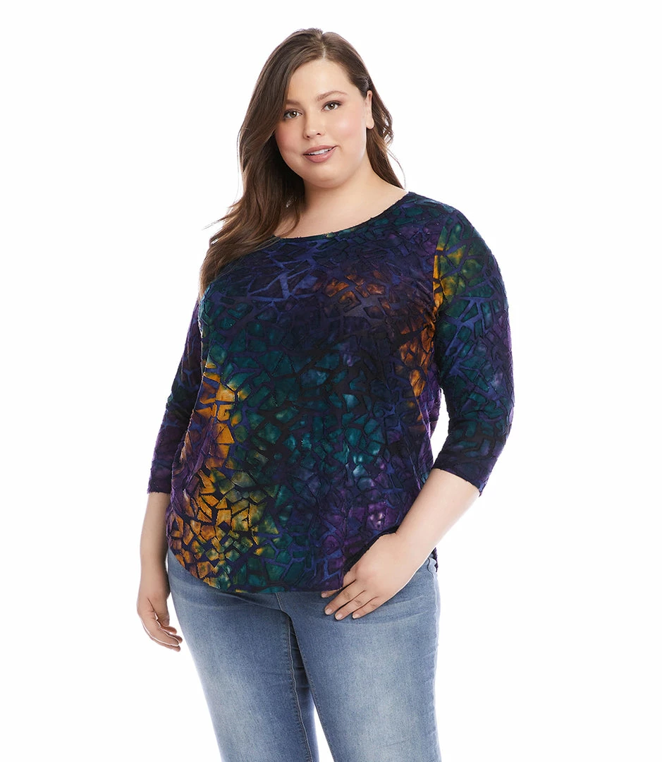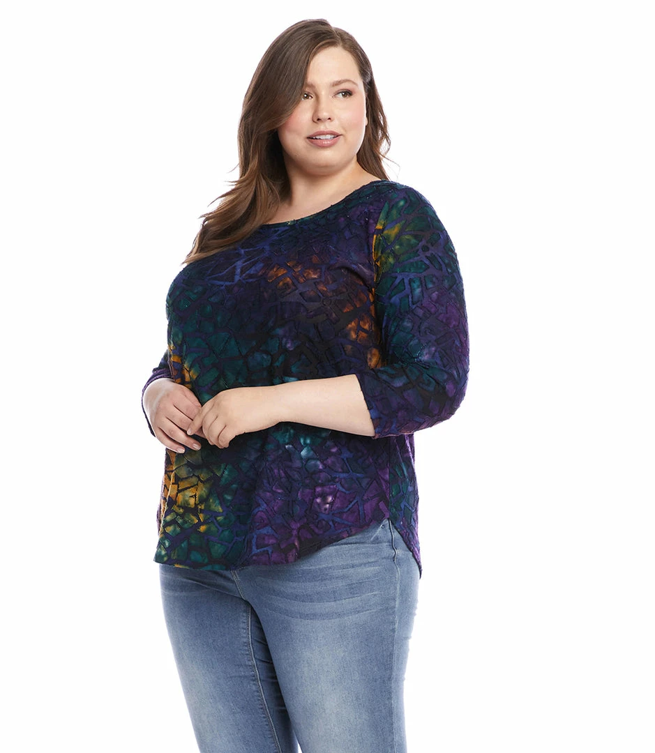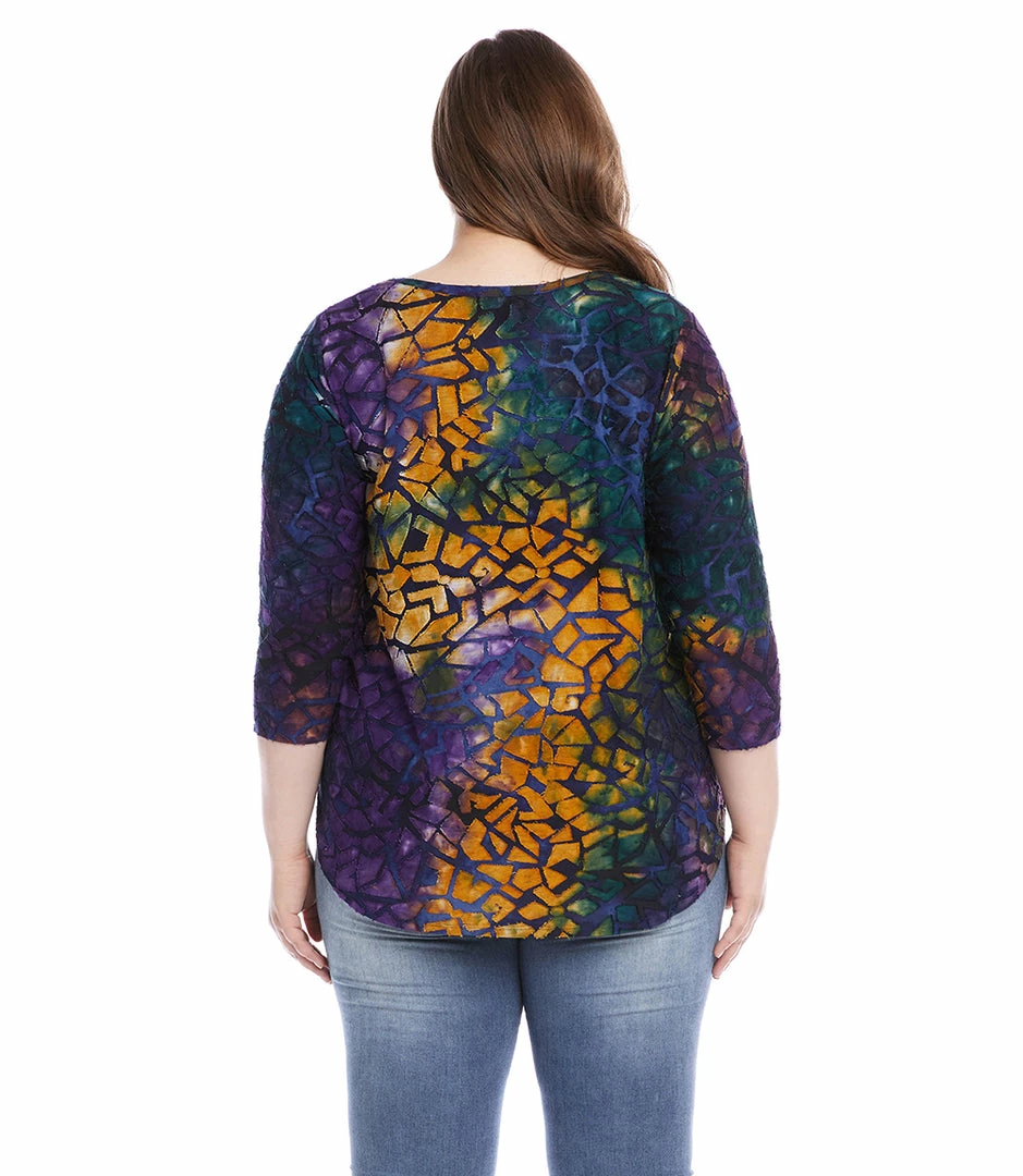 Textural beauty is found in this jacquard top covered in an alluring geometric tie-dye design. It pairs perfectly with your favorite denim.