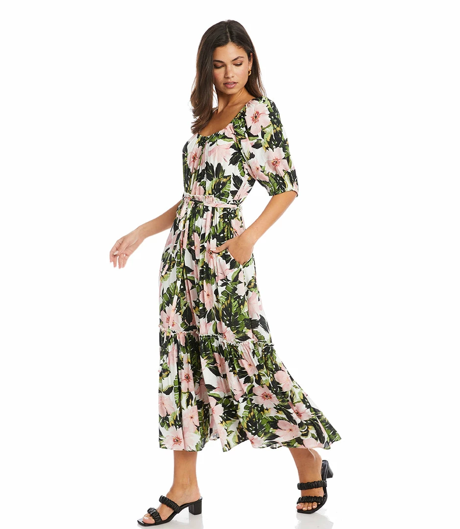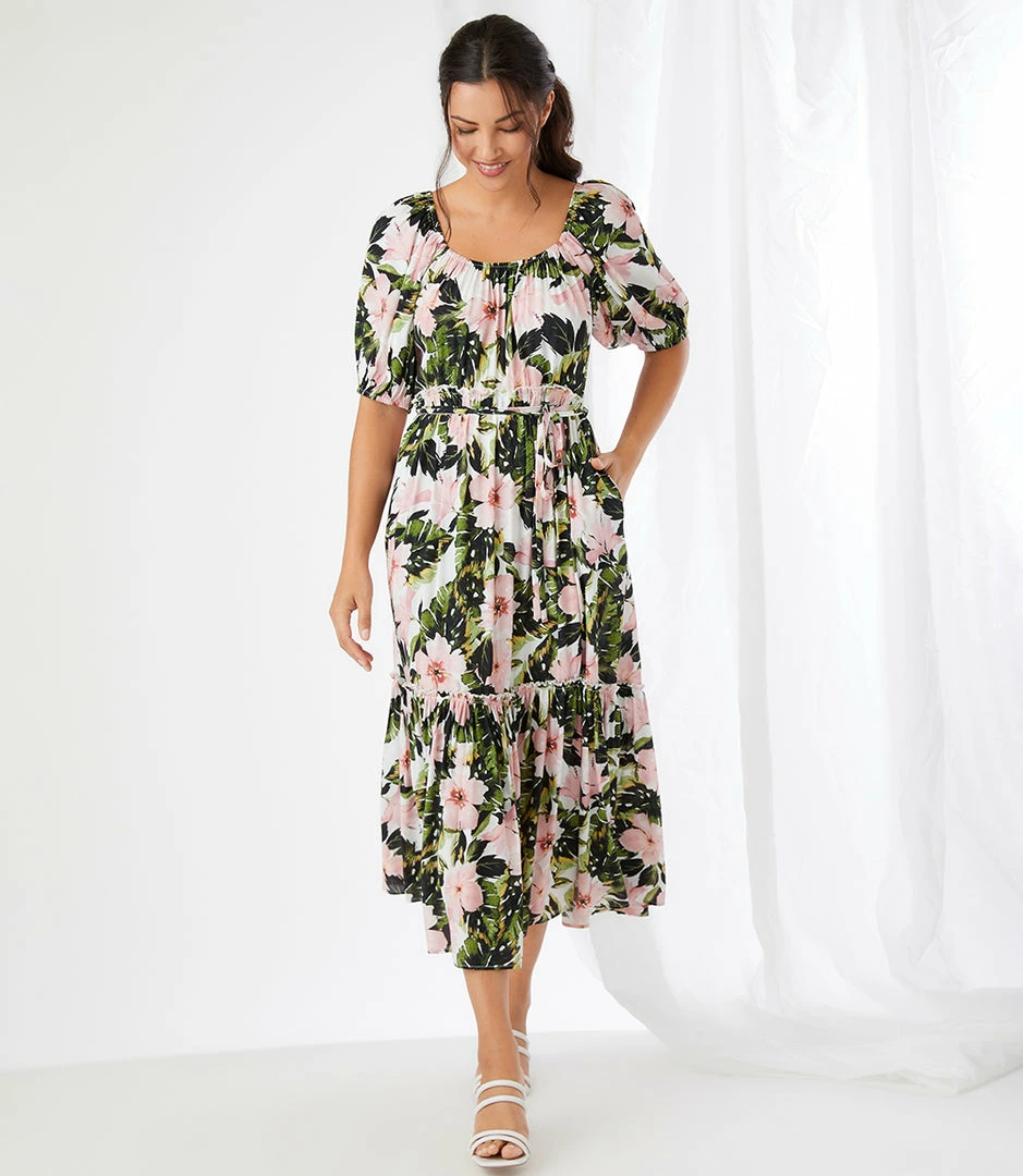 Perfect for wedding season, this eye-catching floral dress is a feminine favorite. Its bohemian styling provides an on-trend look, while the tiered midi silhouette offers soft movement. It also features a flattering cinched waist and matching belt.