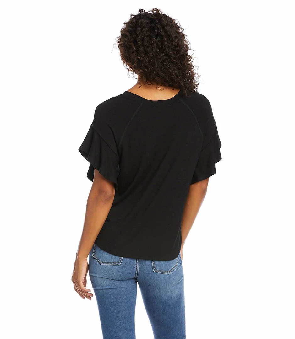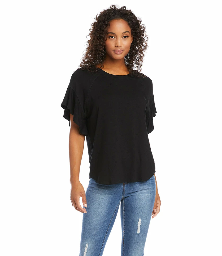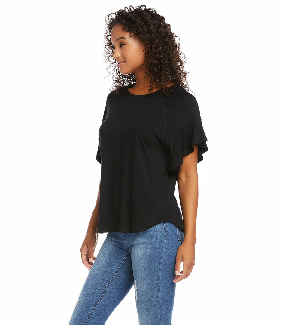 Decadent ruffled sleeves enhance the romance in this top cut from super soft jersey-knit. This top pairs perfectly with your favorite denim.