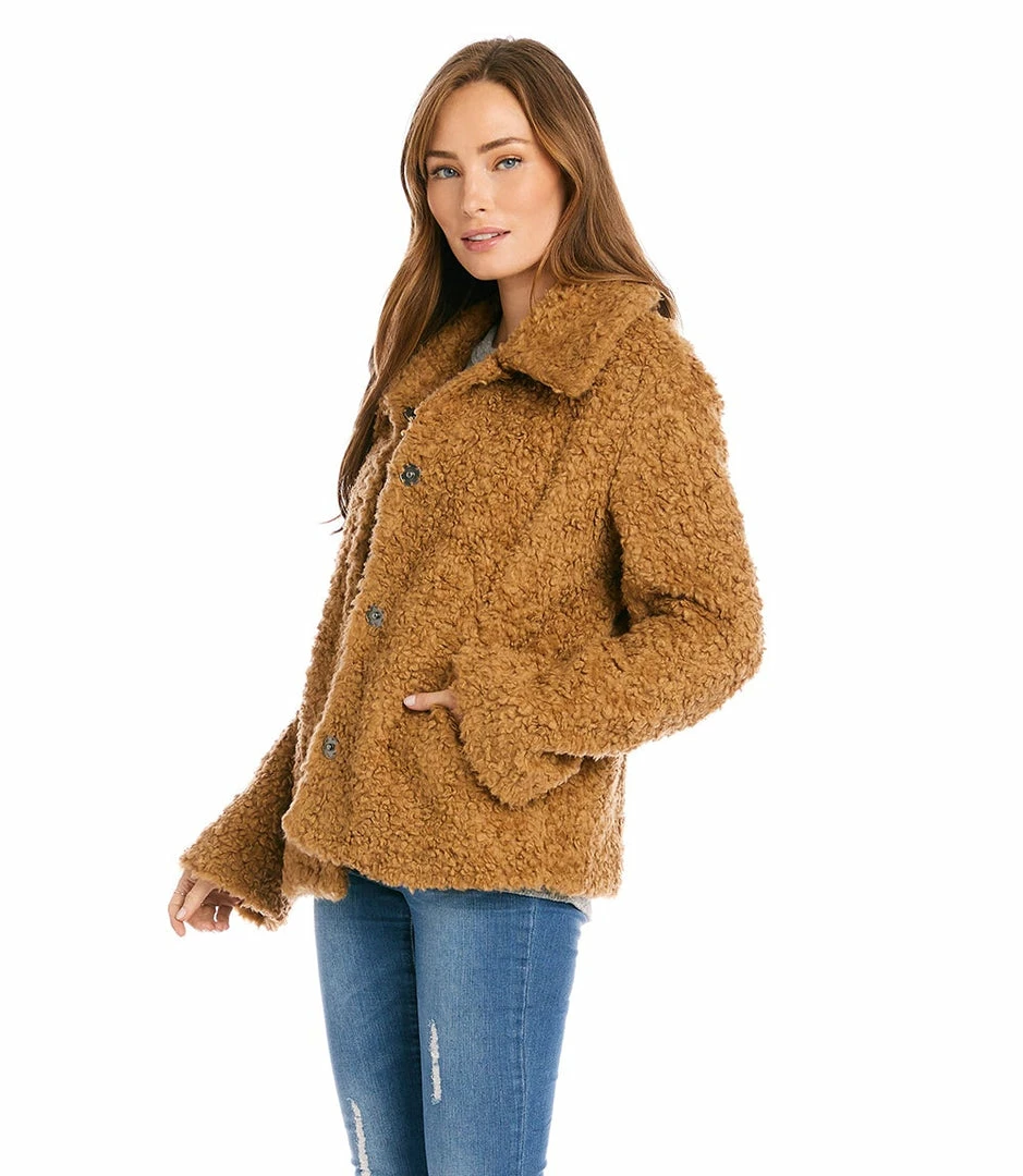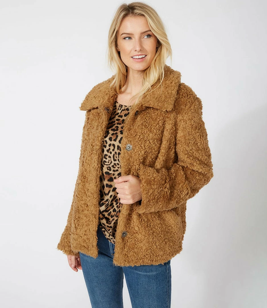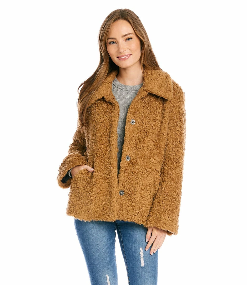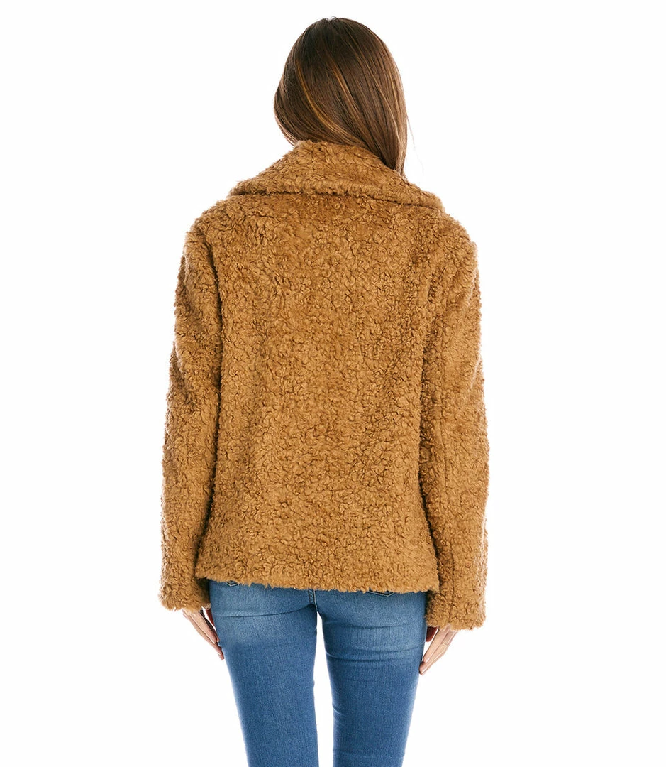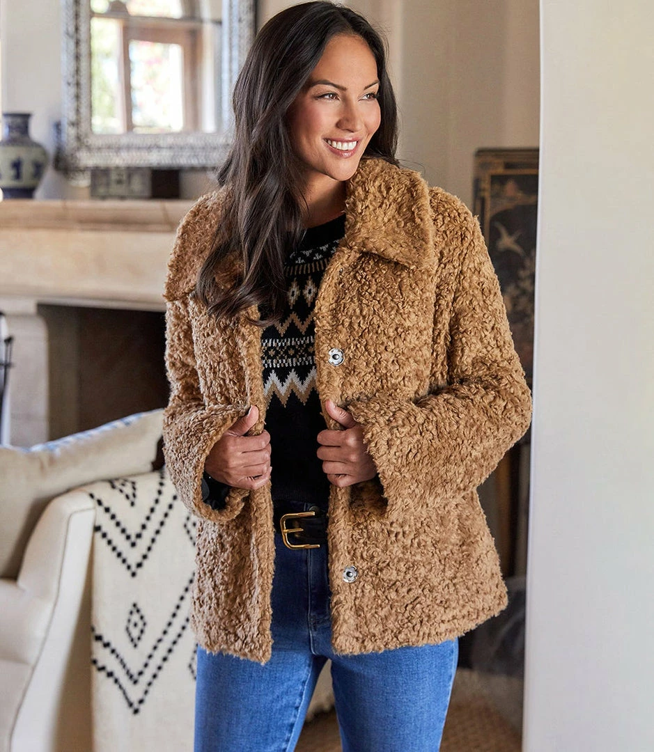 Cozy up to this fuzzy jacket crafted from Italian Sherpa fur. It’s outfitted with pockets for additional warmth.