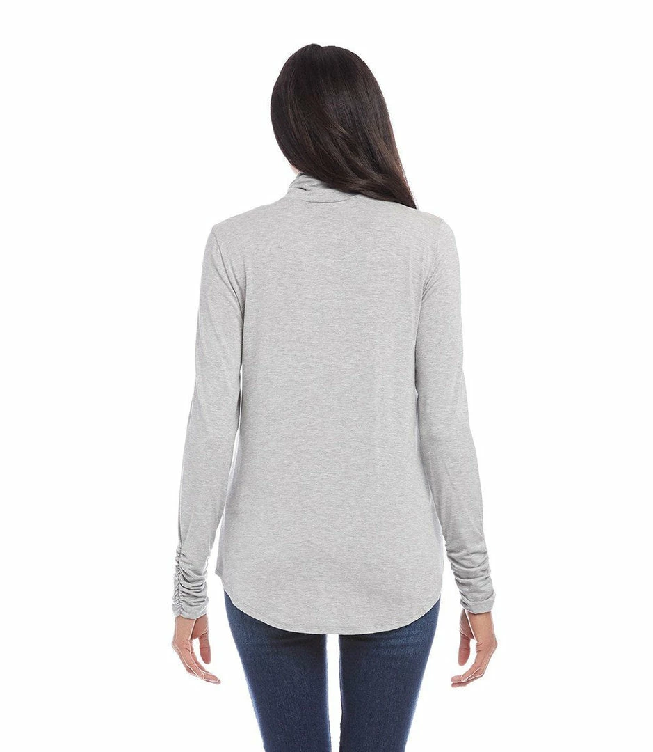 This simple, easy and face framing soft jersey-knit turtleneck top is perfect for layering. Subtle shirring at the sleeve adds unexpected charm.