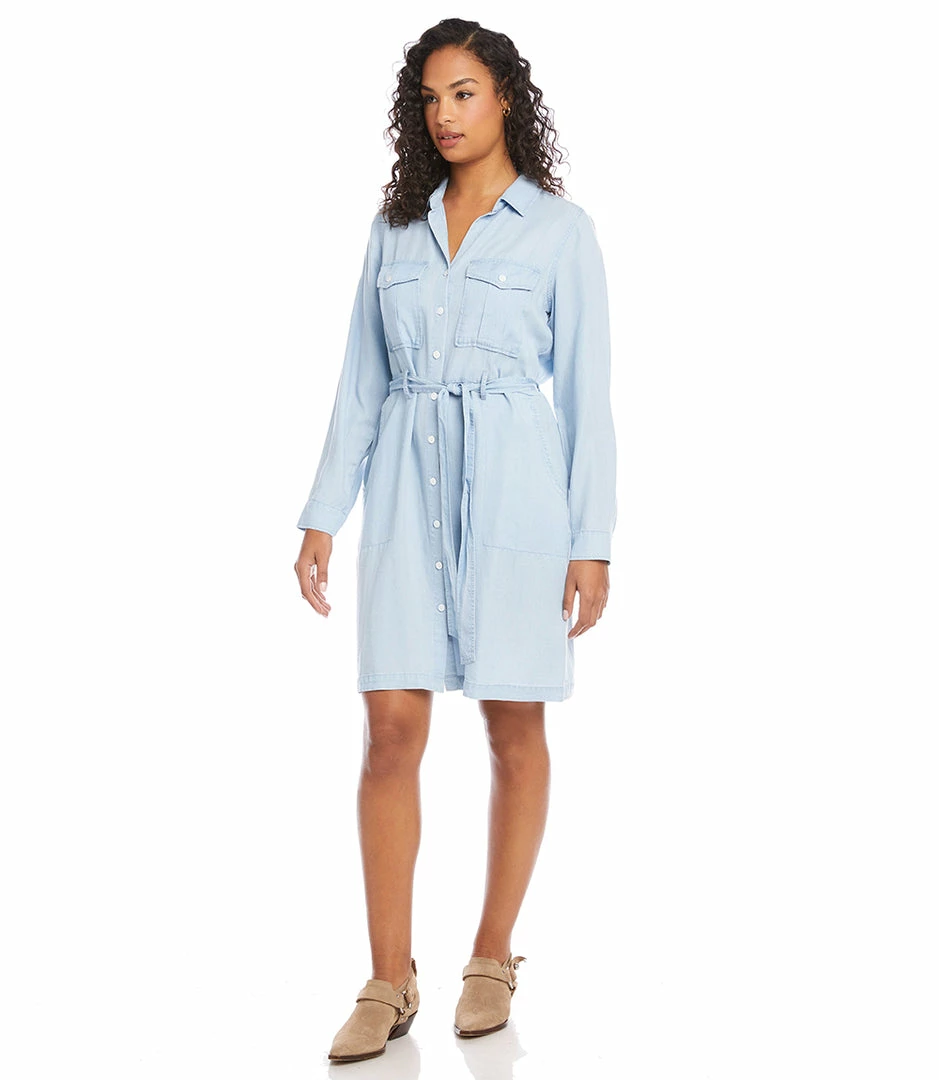 Soft and lightweight chambray shapes an effortlessly feminine shirtdress detailed with patch pockets and a polished button-down. It also features a flattering cinched waist and matching belt.