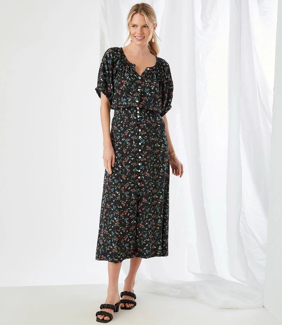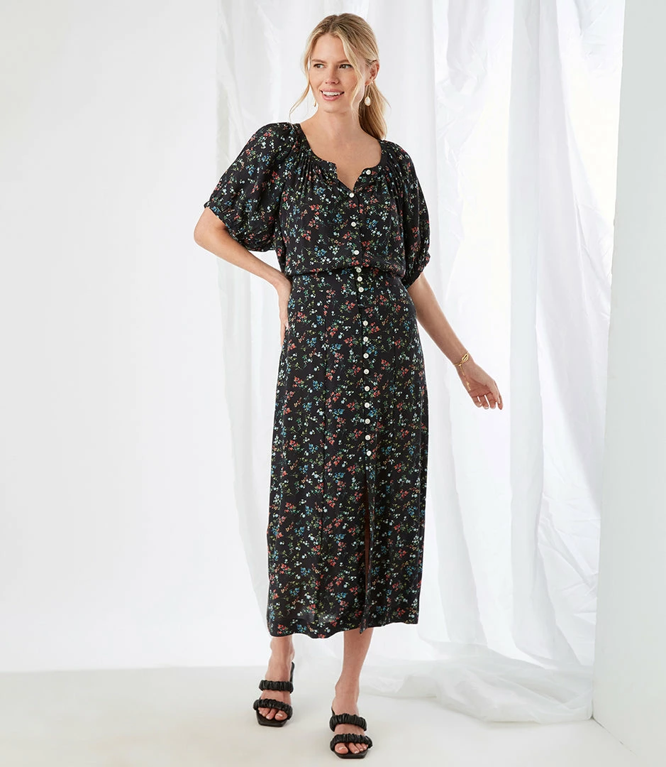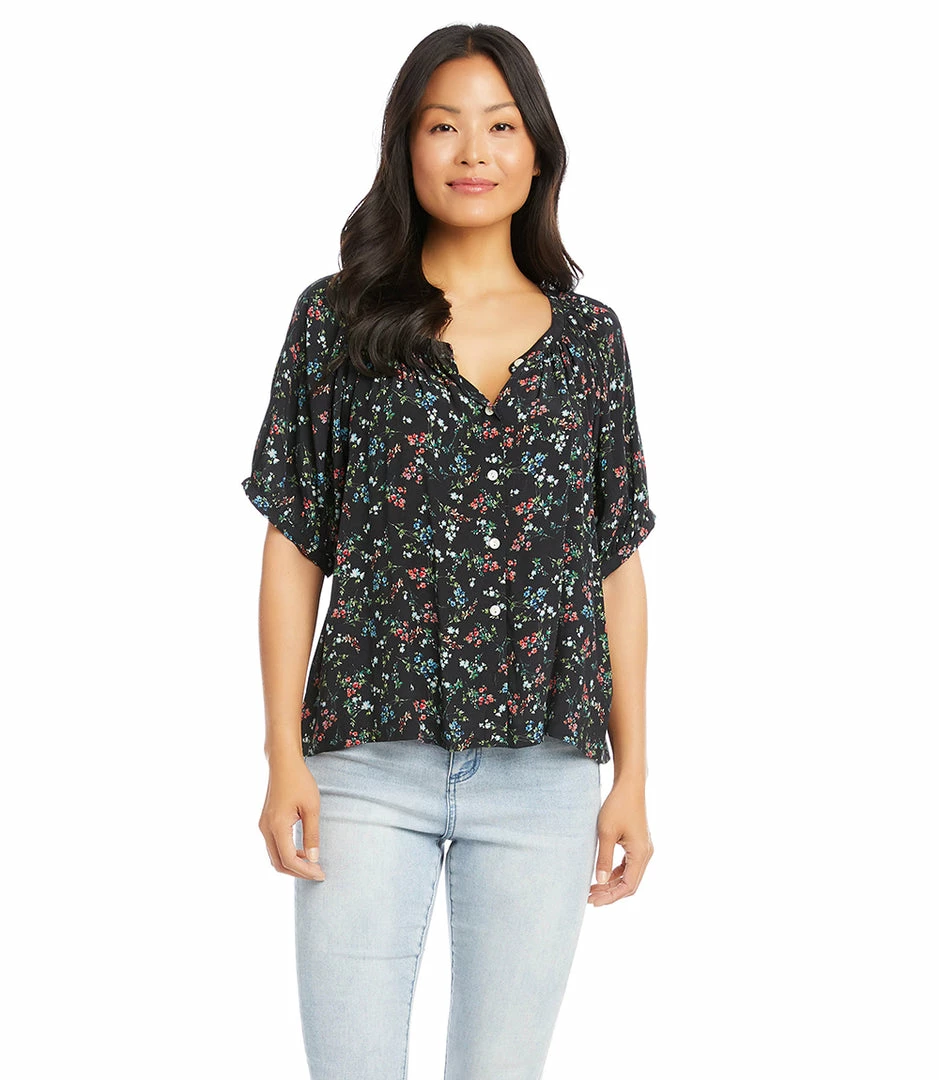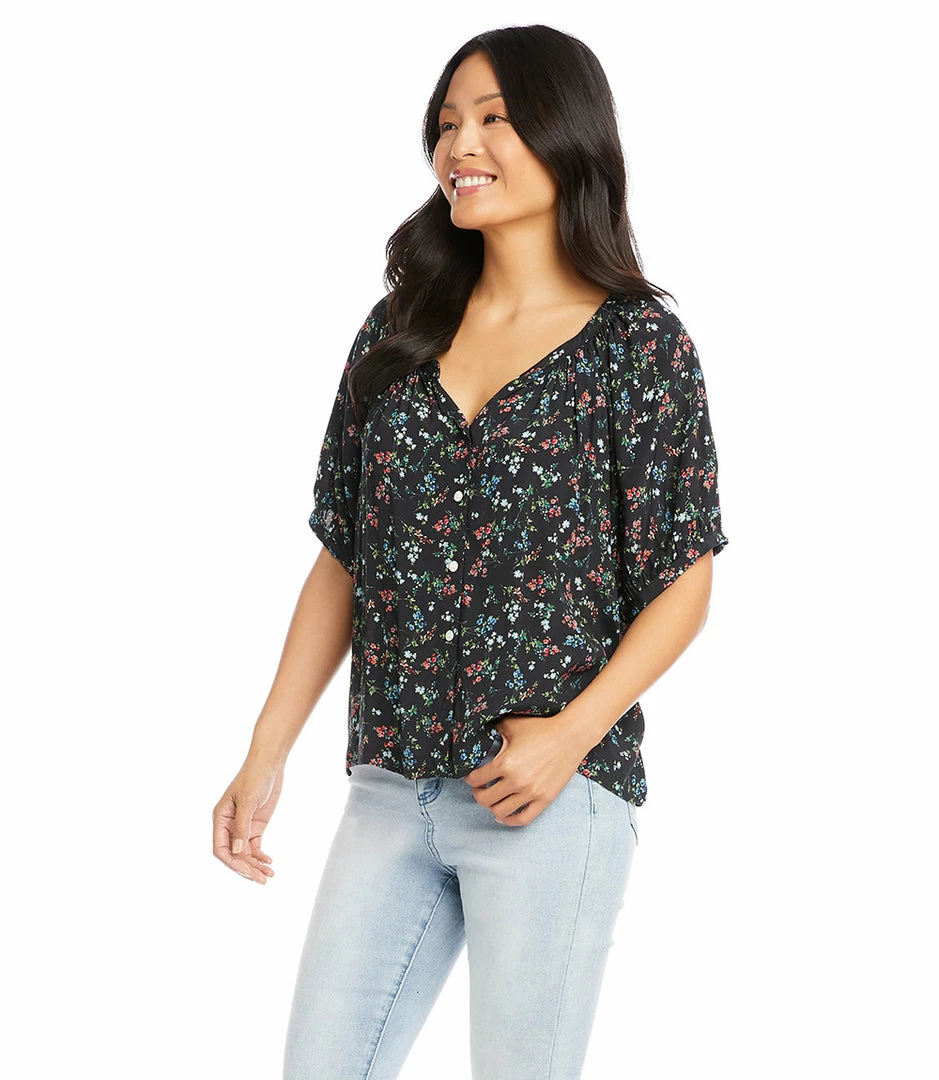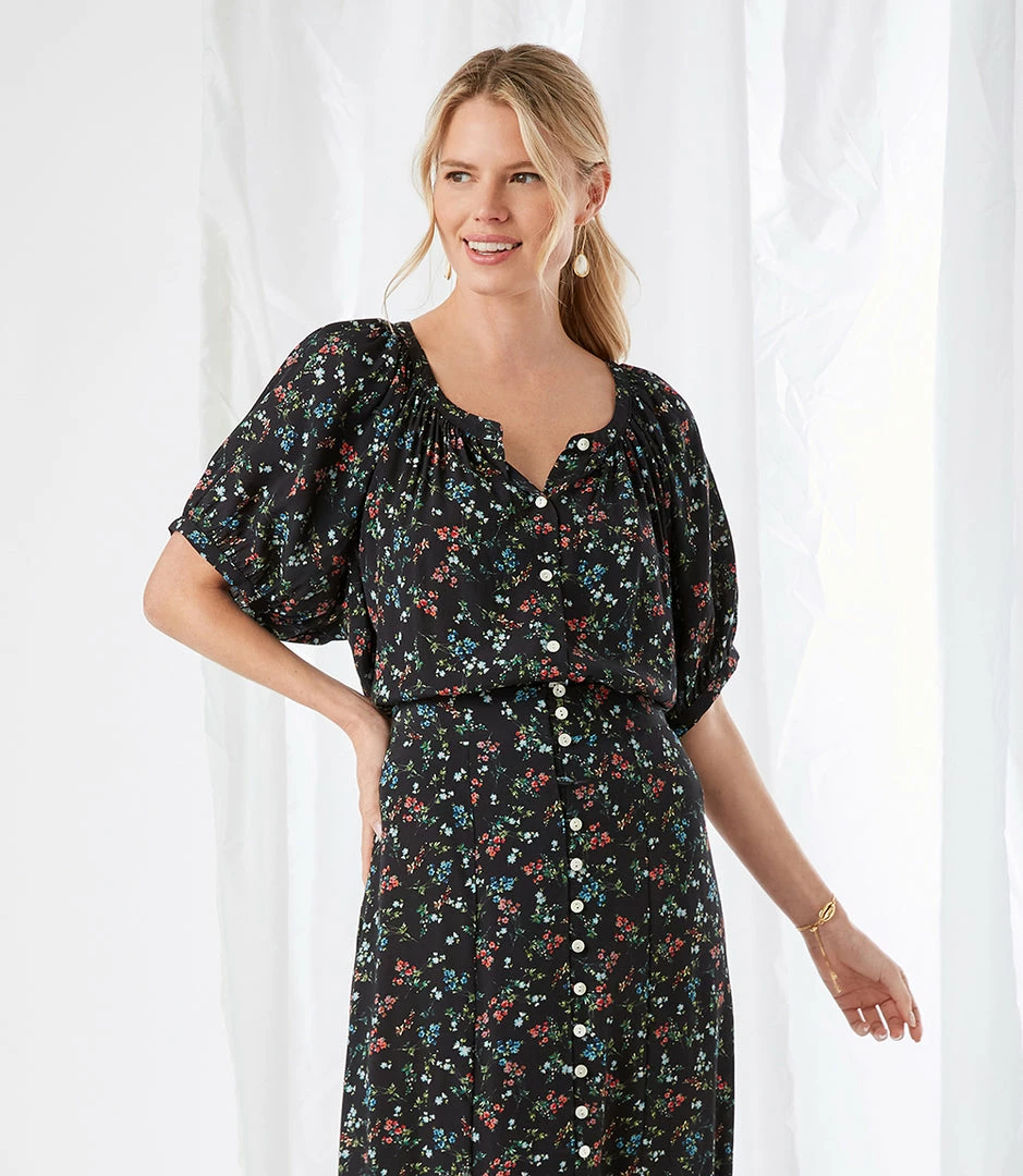 Puffed shoulders and a button-front peasant silhouette lend feminine flair to this breezy top. Pair it with high-waisted jeans or tailored shorts—its outfit possibilities are endless.