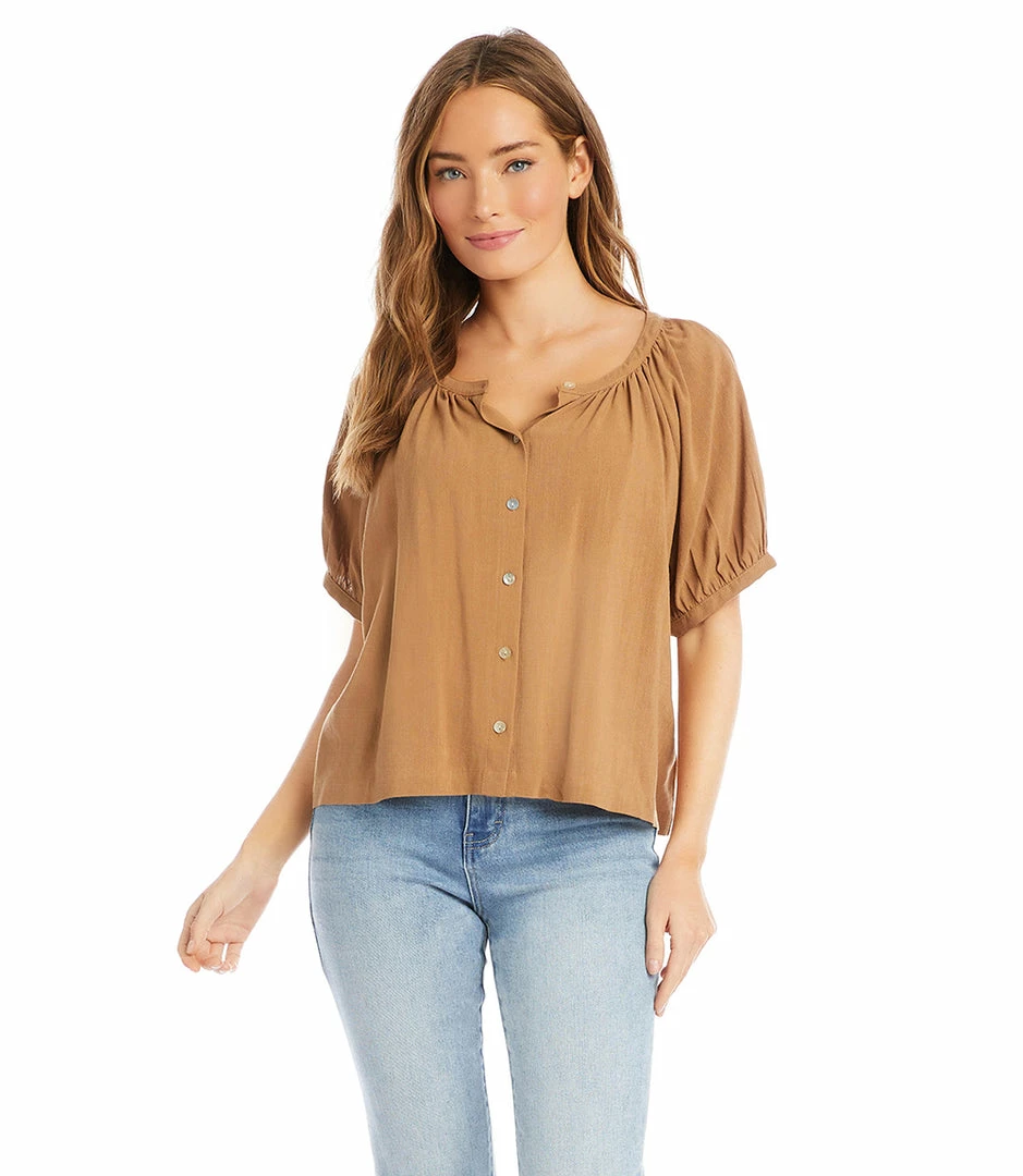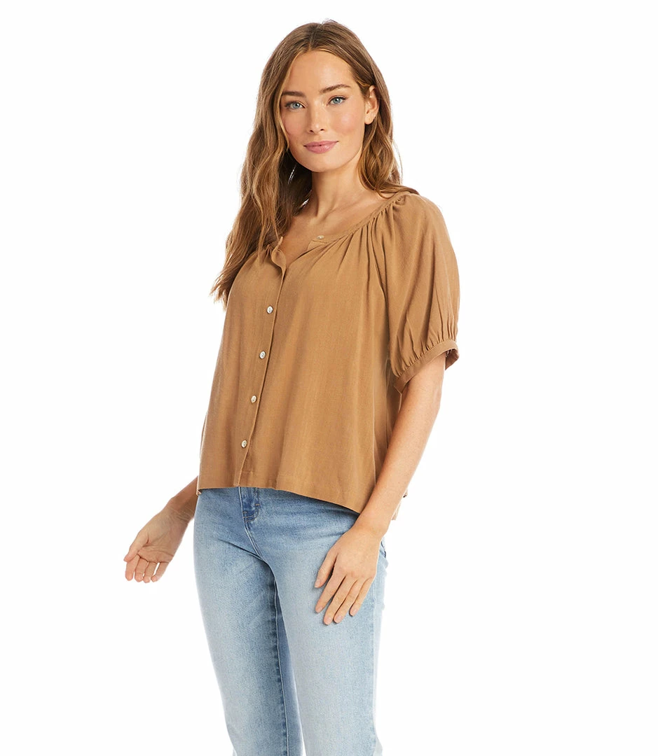 Puffed shoulders and a button-front peasant silhouette lend feminine flair to this linen blend top. Pair it with it’s matching linen blend pants for a polished look.