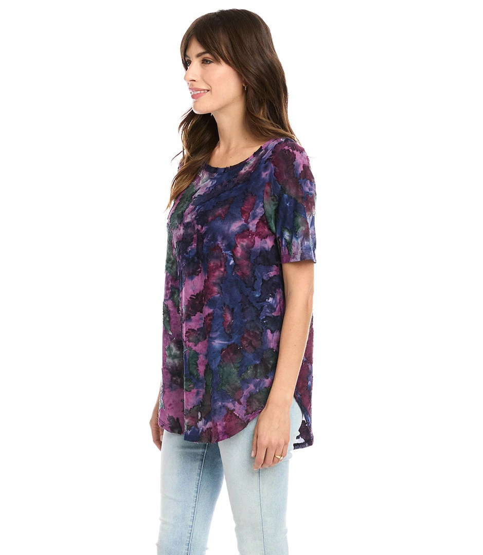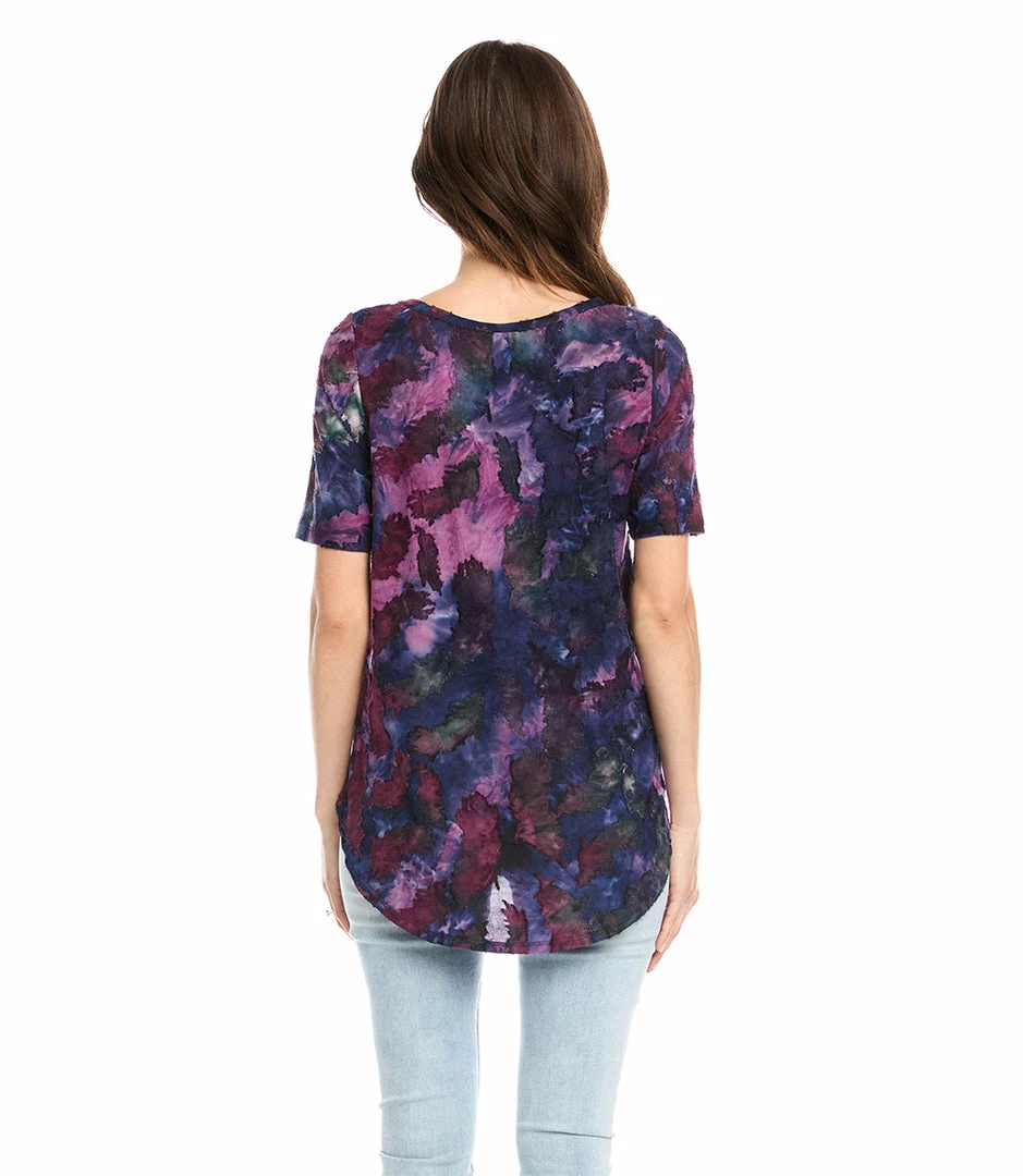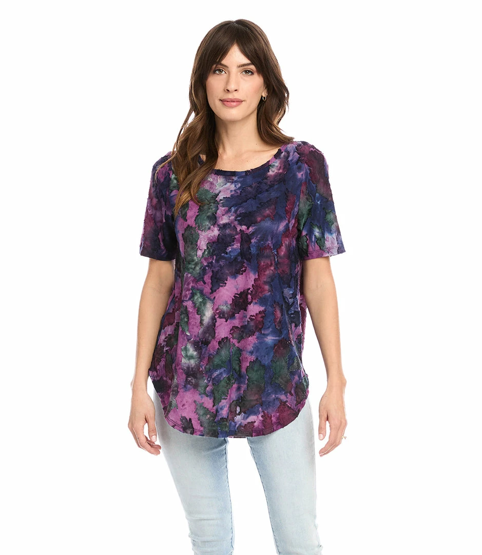 Textural beauty is found in this jacquard top covered in an alluring feather pattern tie-dye design. It pairs perfectly with your favorite denim.