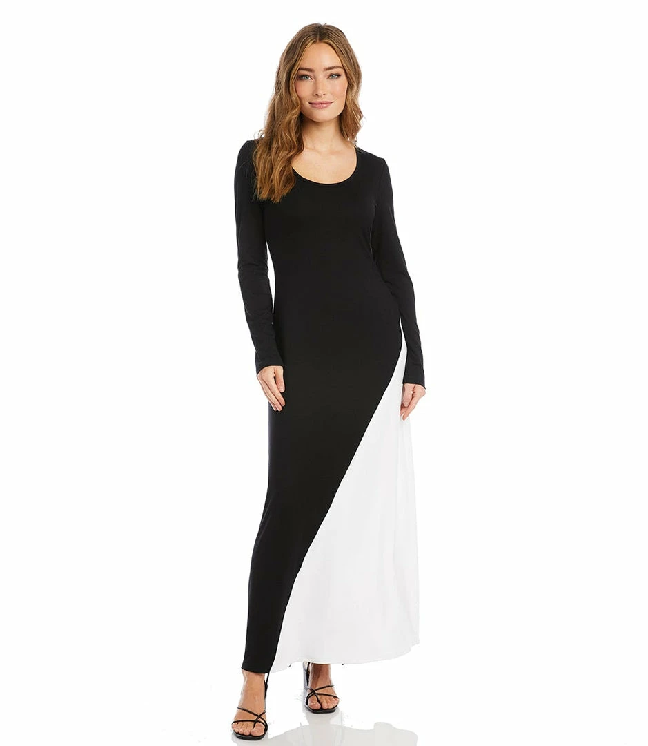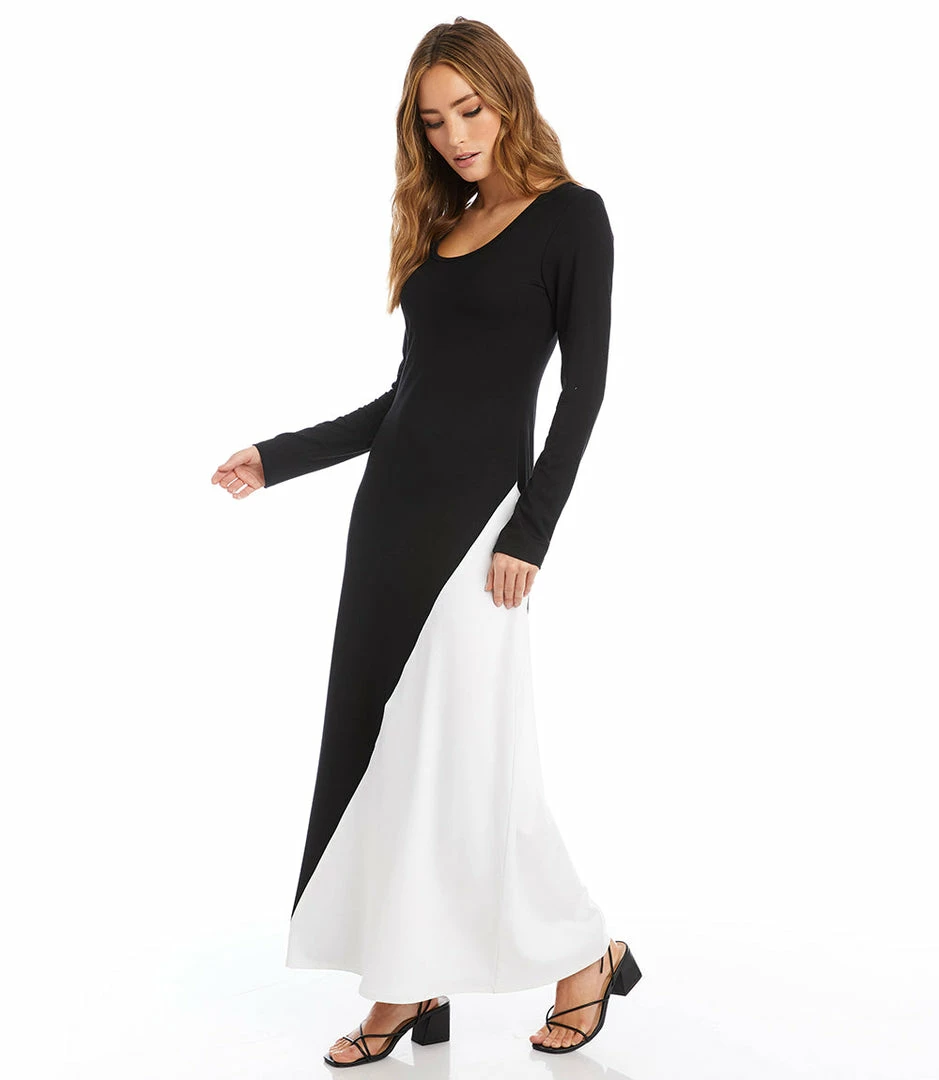 Elegant and alluring, this floor-length monochromatic dress offers a contemporary element with its split color-blocking.