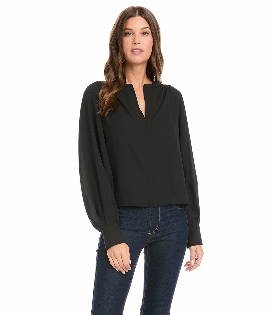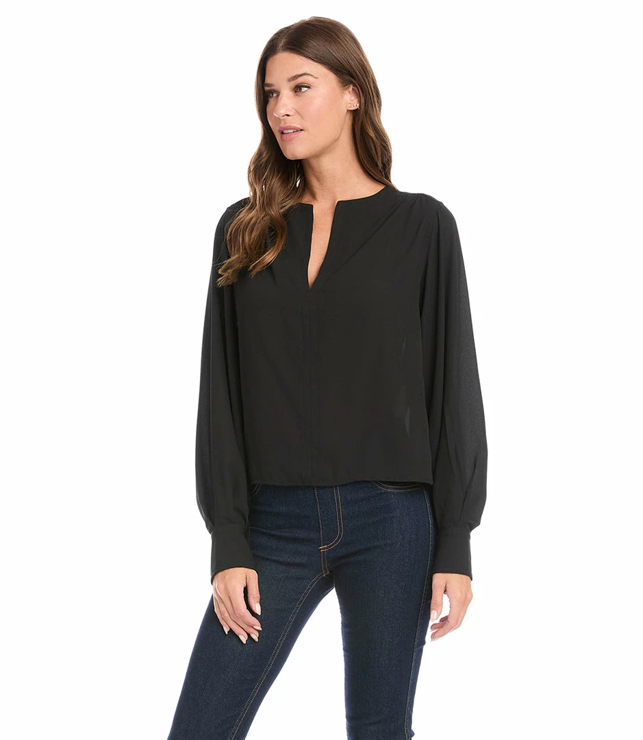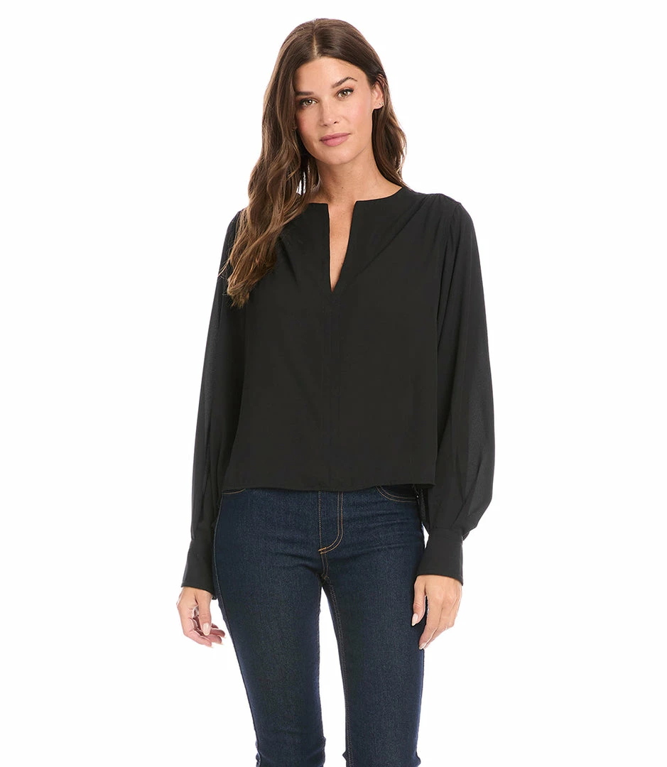 A modern front placket and romantic shirring at the sleeve distinguishes this crepe top. This top can easily transition from desk to dinner.