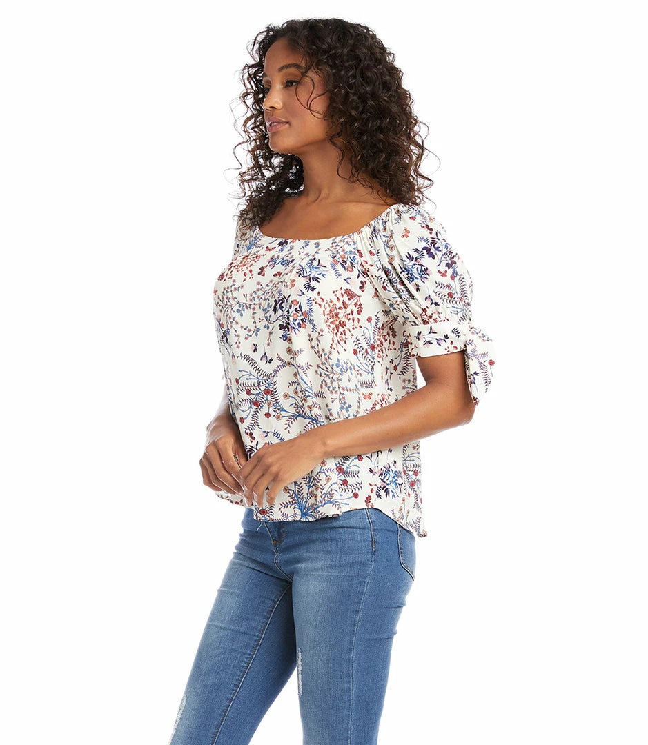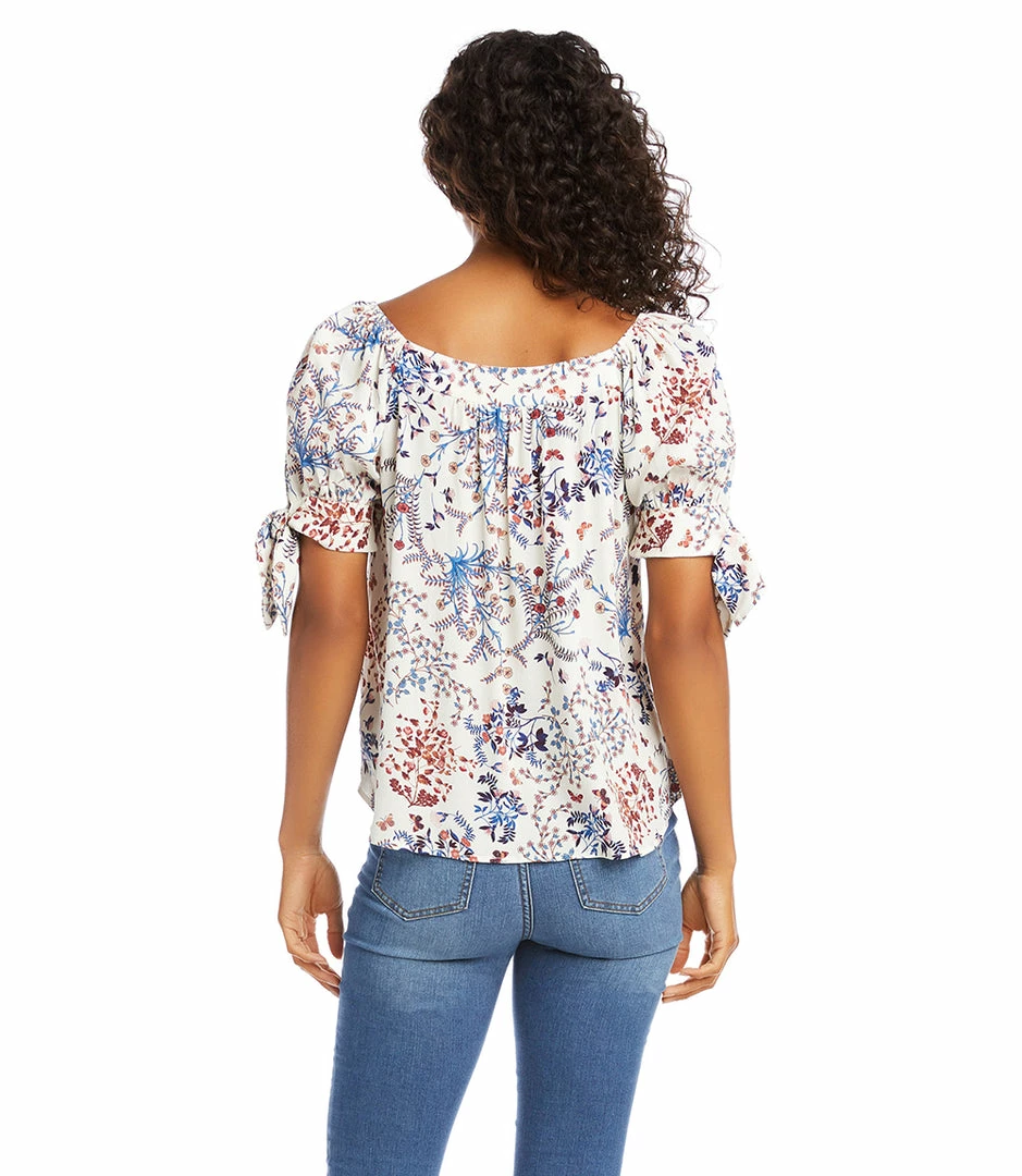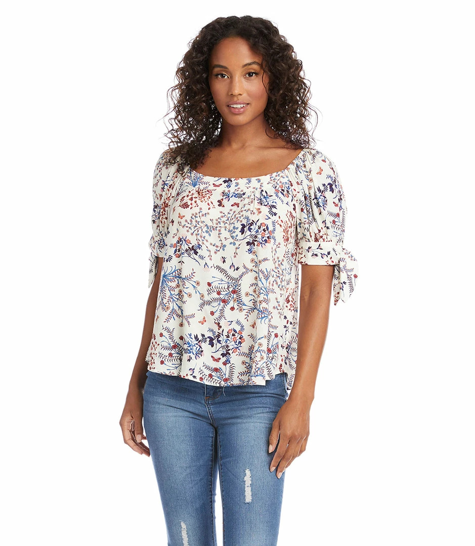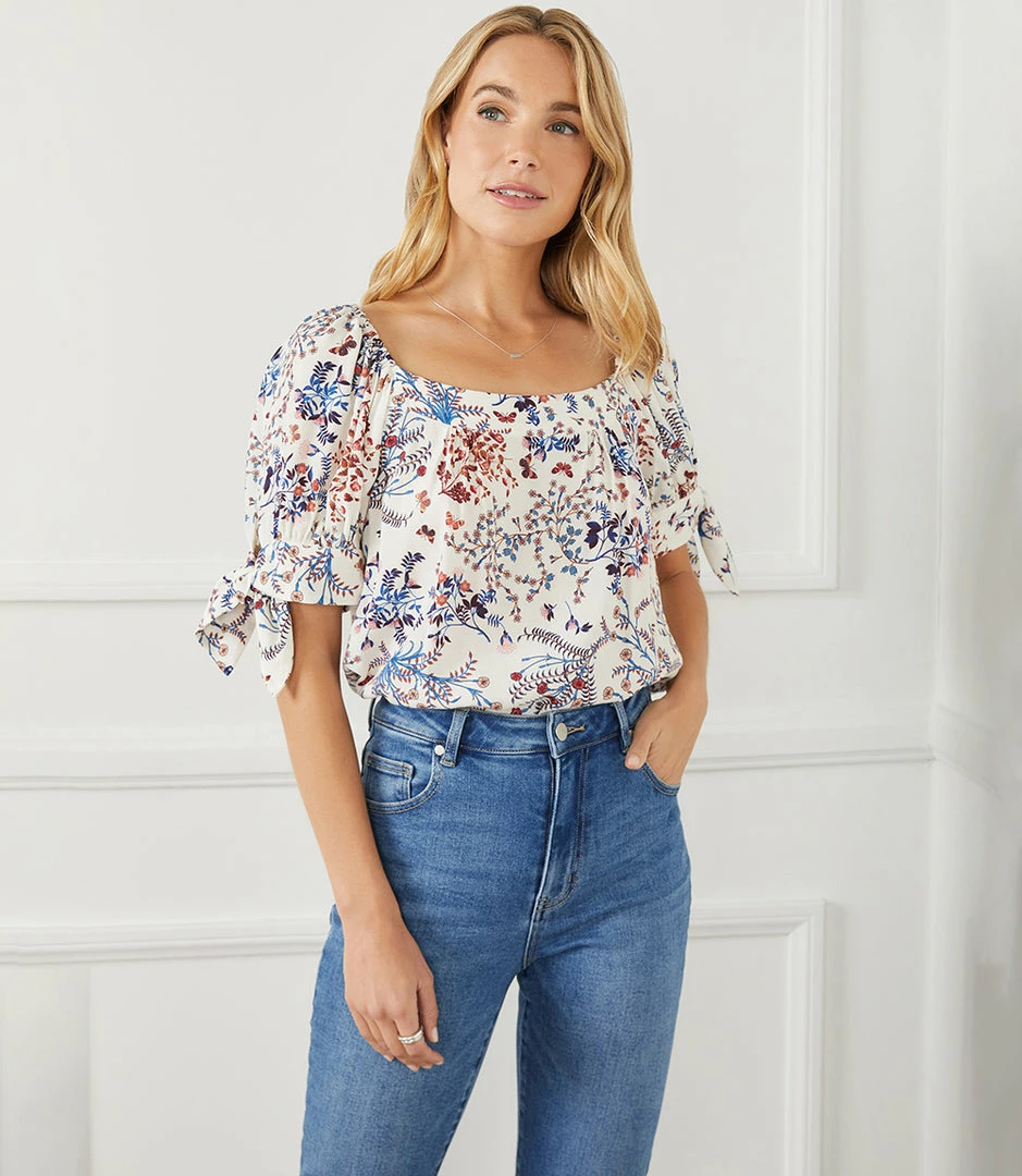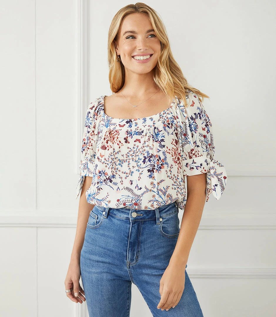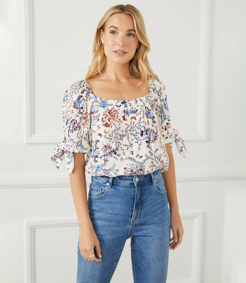 This charming top features a trend-right square neckline and short sleeves detailed with darling ties at the cuff. The perfect partner to all your denim, or any pair of black or white pants, this feminine style is the ultimate day-to-night piece.