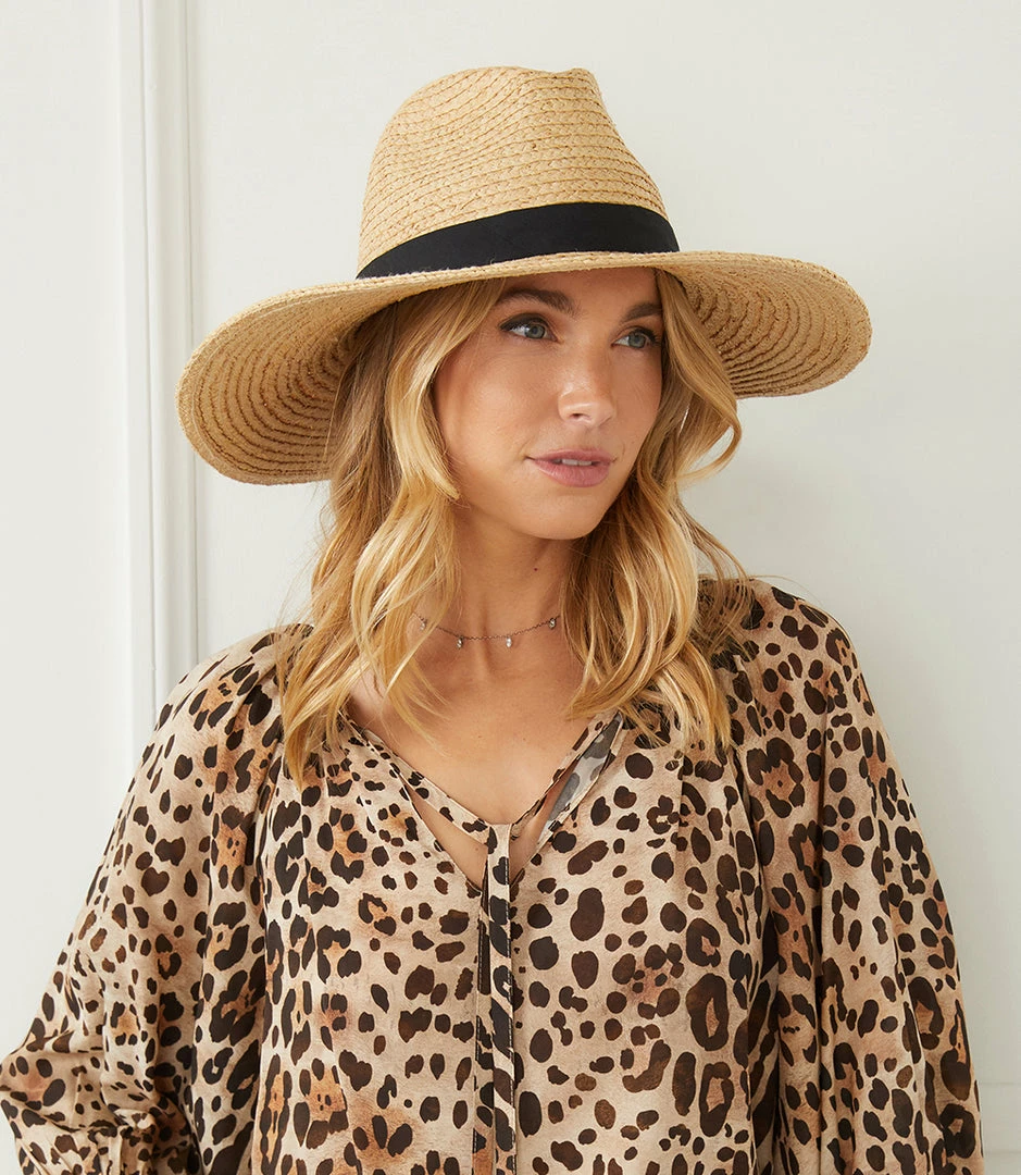 Contrasting ribbon wraps the crown of this panama style hat. A wide brim provides protection from the sun.