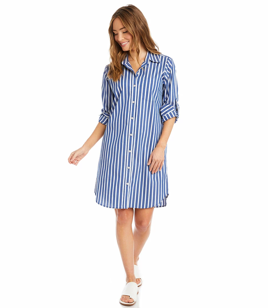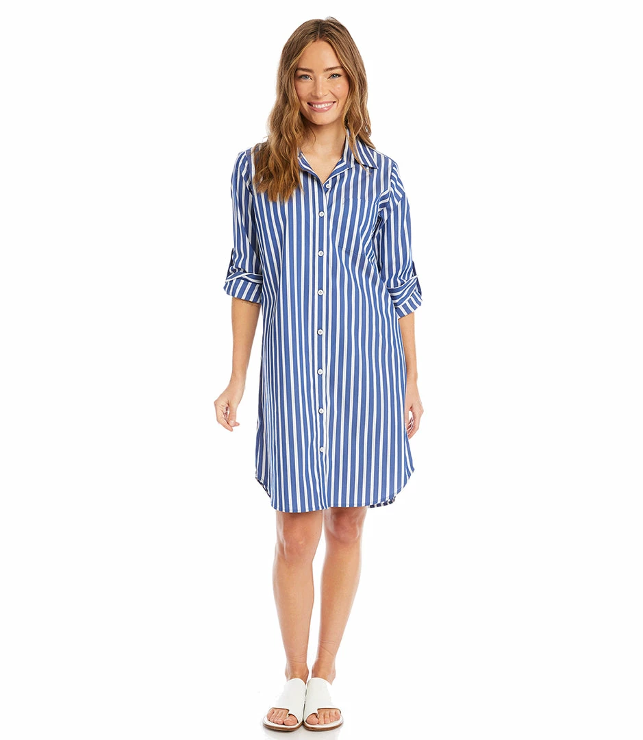 This versatile button-front dress features cuffed roll-tab sleeves, a shirt pocket, and a comfortably stretchy fit that is perfect for warmer weather. Wear it open as a jacket, or buttoned as a dress.