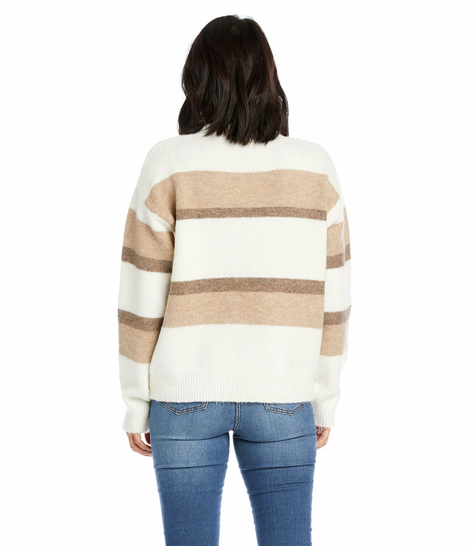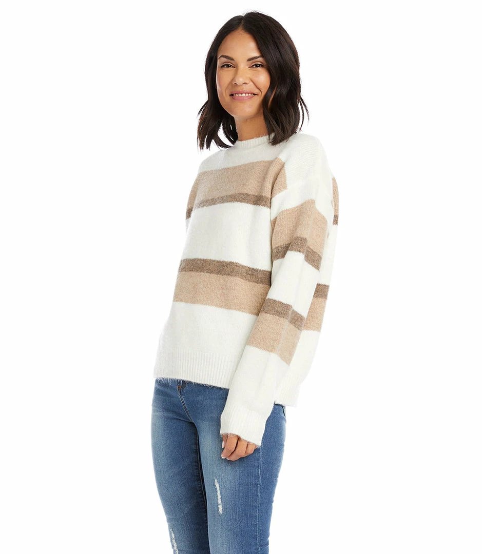 In soft shades of oatmeal and brown, this cozy pullover sweater with ribbed hems will keep you warm all season long.