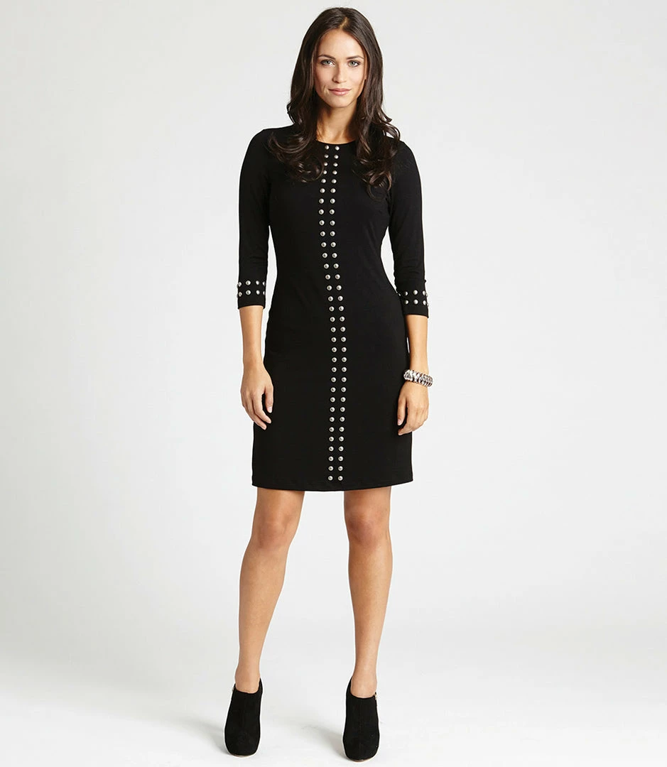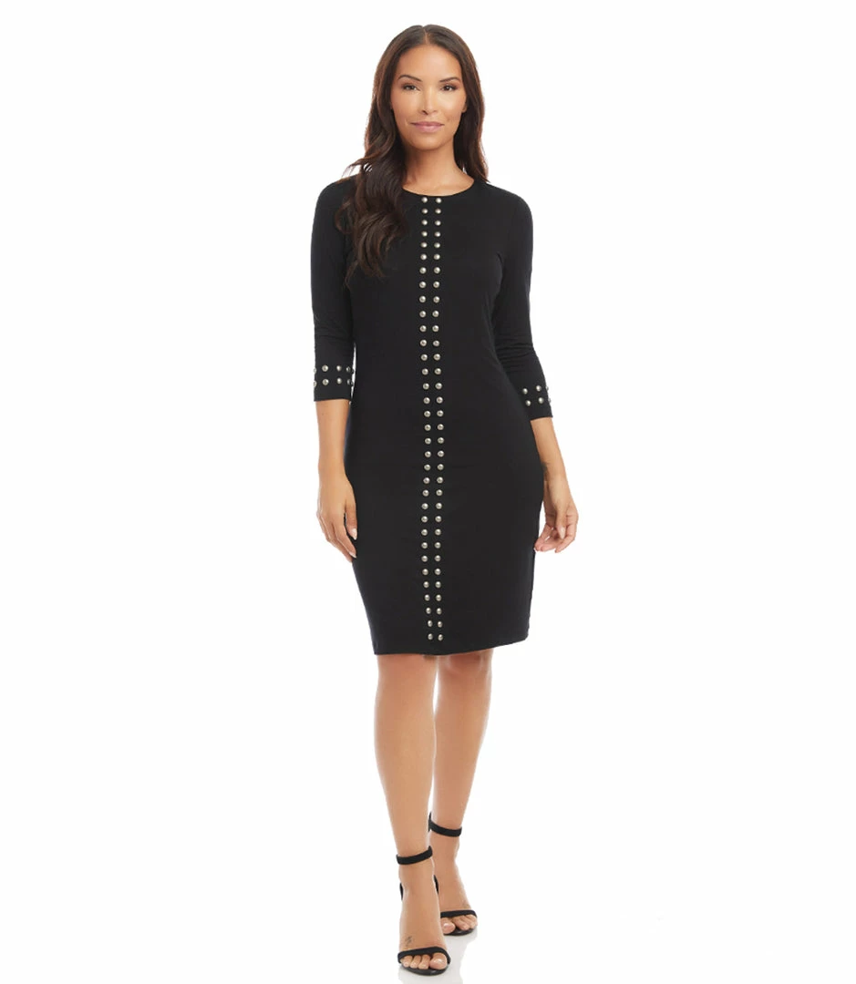 This curve-defining dress follows your curves with its sultry form-fitting silhouette. Silver studs lend a tough-luxe look to this classic little black dress.