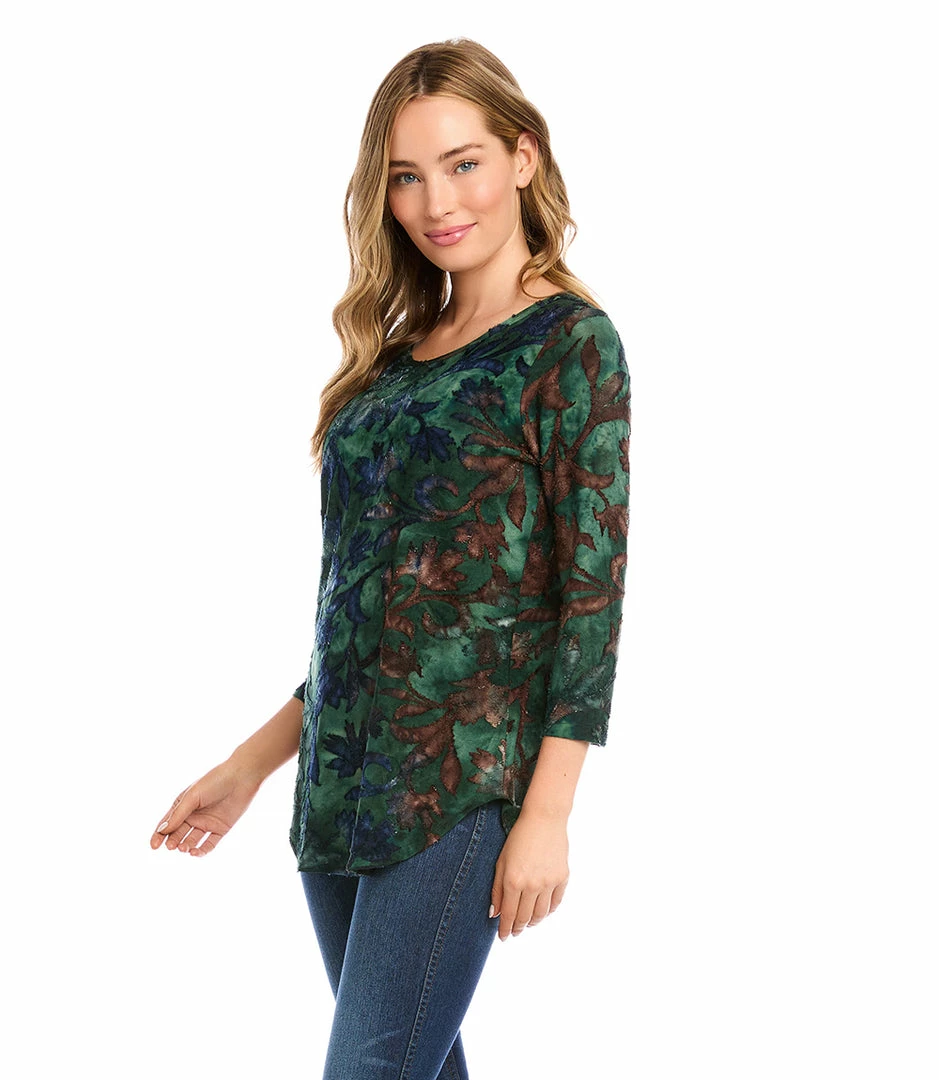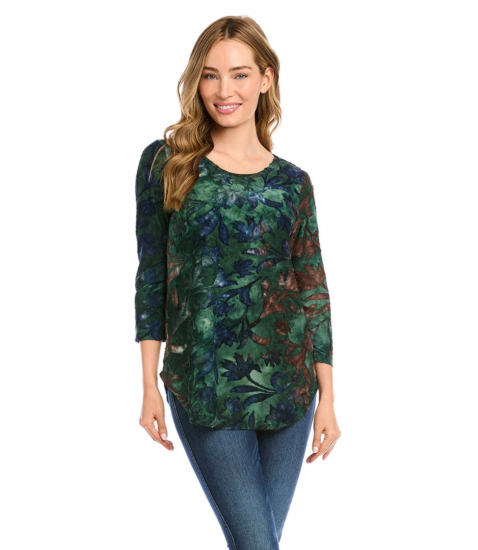Textural beauty is found in this jacquard top covered in an alluring floral tie-dye design. It pairs perfectly with your favorite denim.