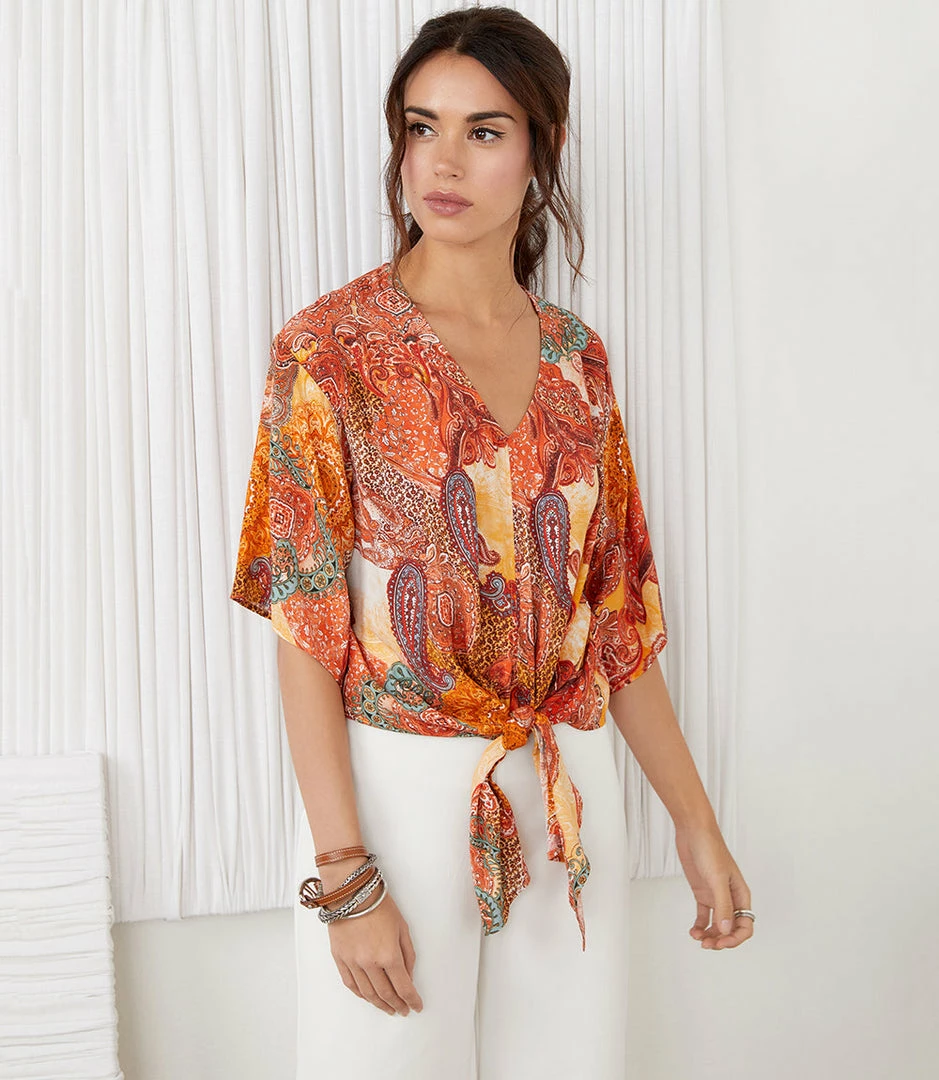Designed to set a bohemian aesthetic, this vibrant paisley print top features billowy flare sleeves and a stylish tie-front. It pairs perfectly with your favorite denim.