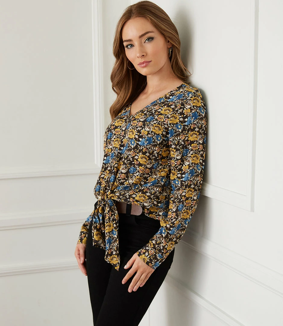 Designed to set a bohemian aesthetic, this vibrant floral print top features a stylish tie-front. It pairs perfectly with your favorite denim.
