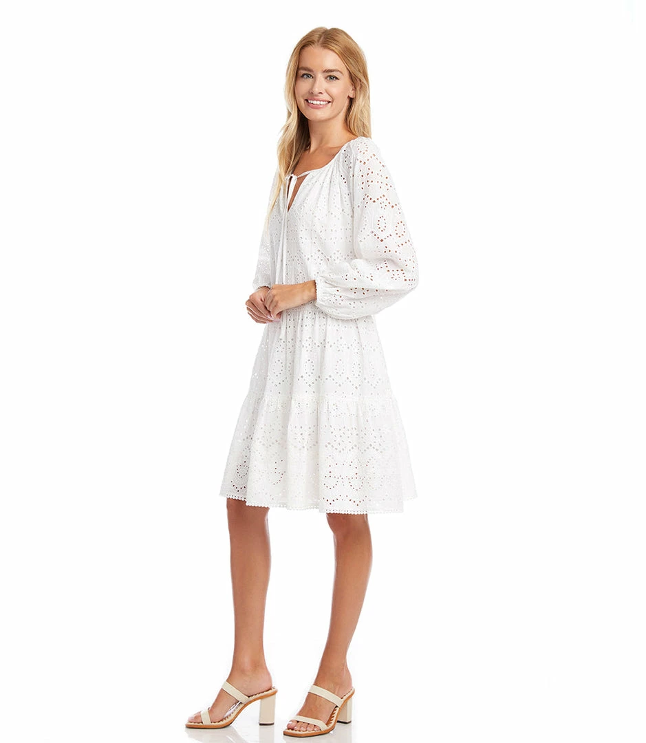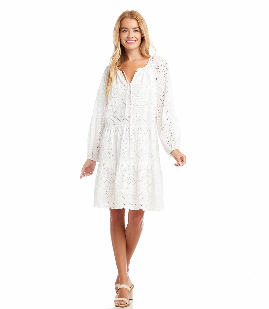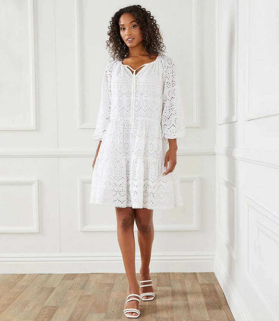 Embroidered eyelet lace embodies the essence of sunny days. Coming in airy embroidered eyelet lace, this swingy dress has a tiered skirt and an easy fit.