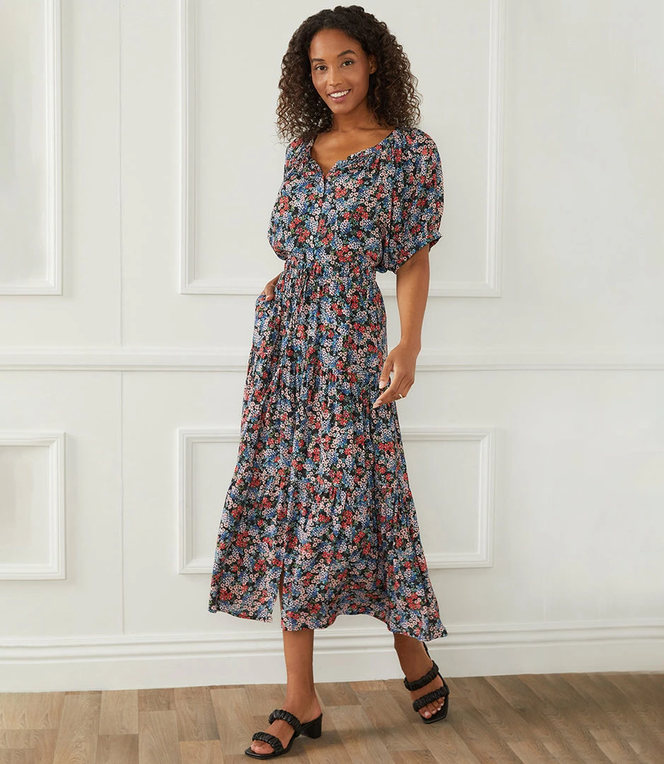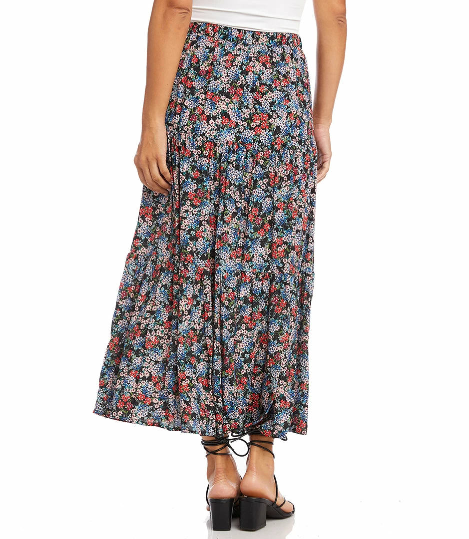 Take a walk in the garden in this free-flowing skirt featuring a fun ditsy floral print and an adjustable elastic waist. Breezy crepe fabric shapes a free-flowing silhouette of a essential midi skirt patterned with a beautiful garden floral print. Its tiered hem enhances the bohemian charm.