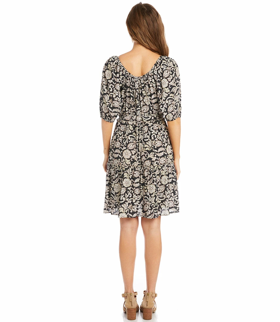An artistic woodblock floral print puts a bohemian focus on this summer-ready dress. This statement-making dress features peasant sleeves, a tiered hem and a flattering cinched waist and matching belt.