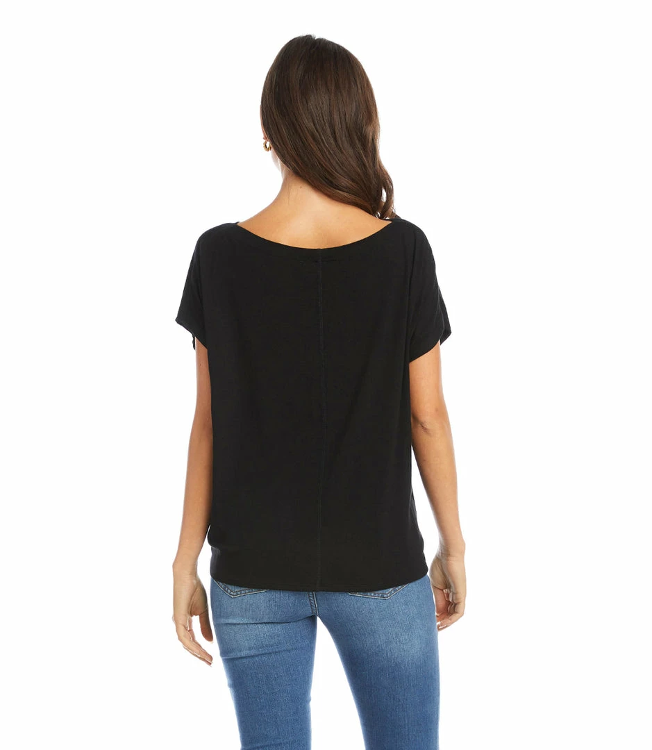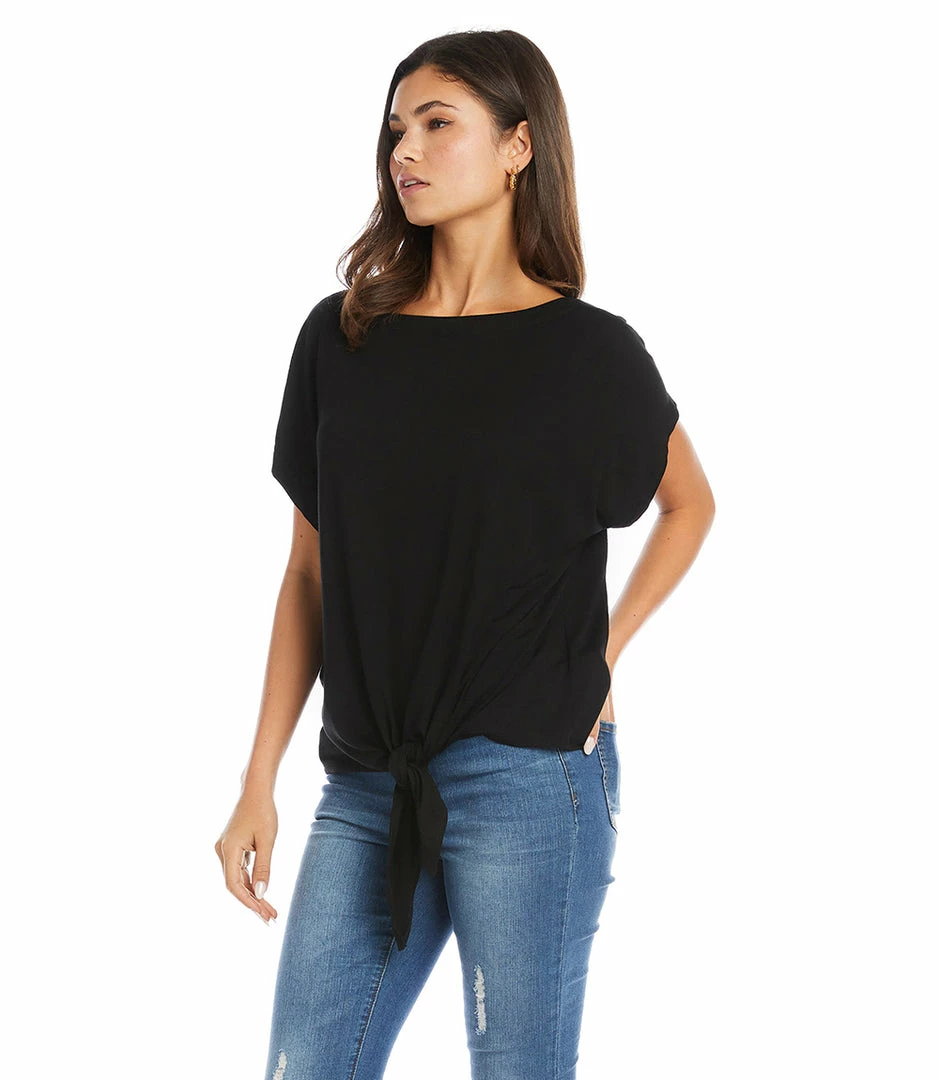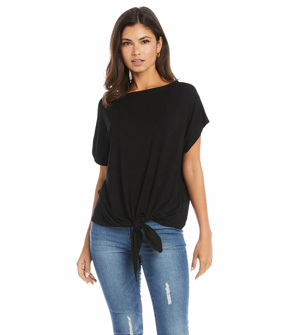 Cinched at the waist for a figure-flattering fit, this jersey-knit top features a sleek boat neckline, drop shoulder sleeves, and stylish tie-front.