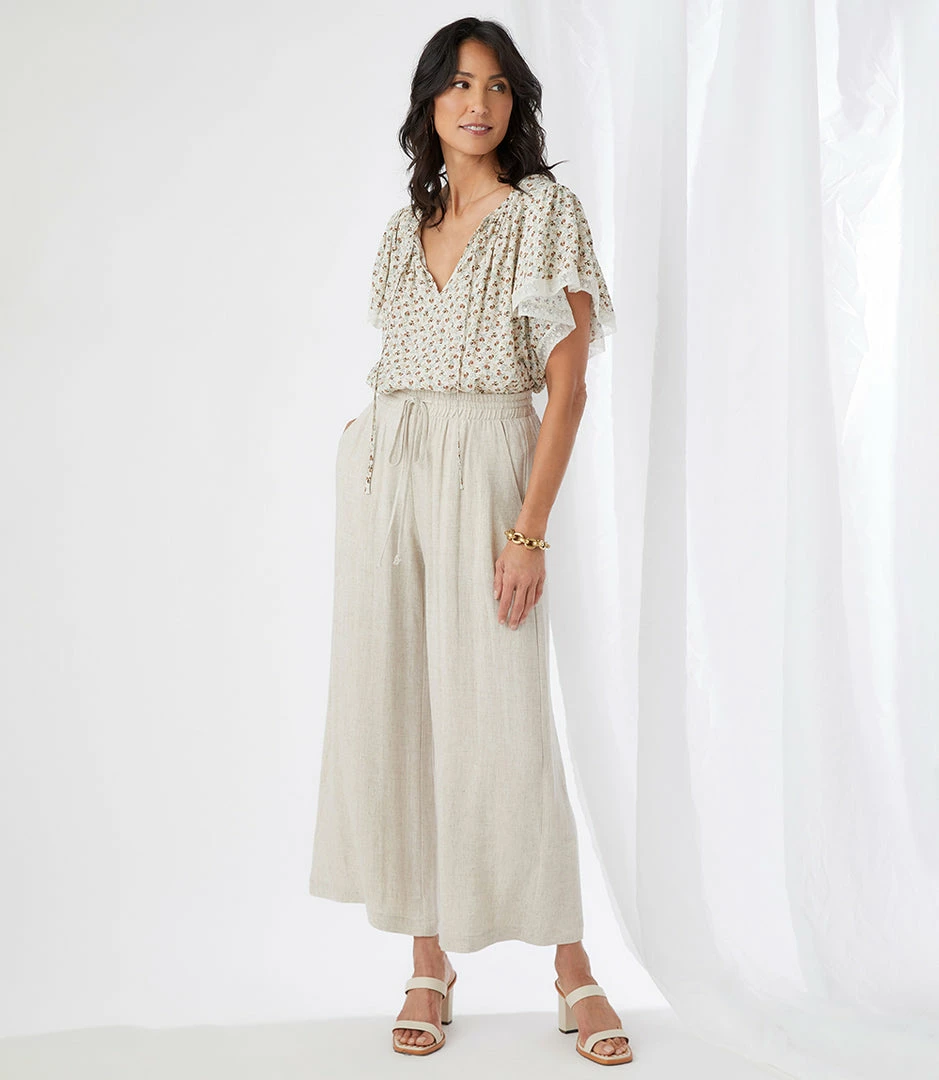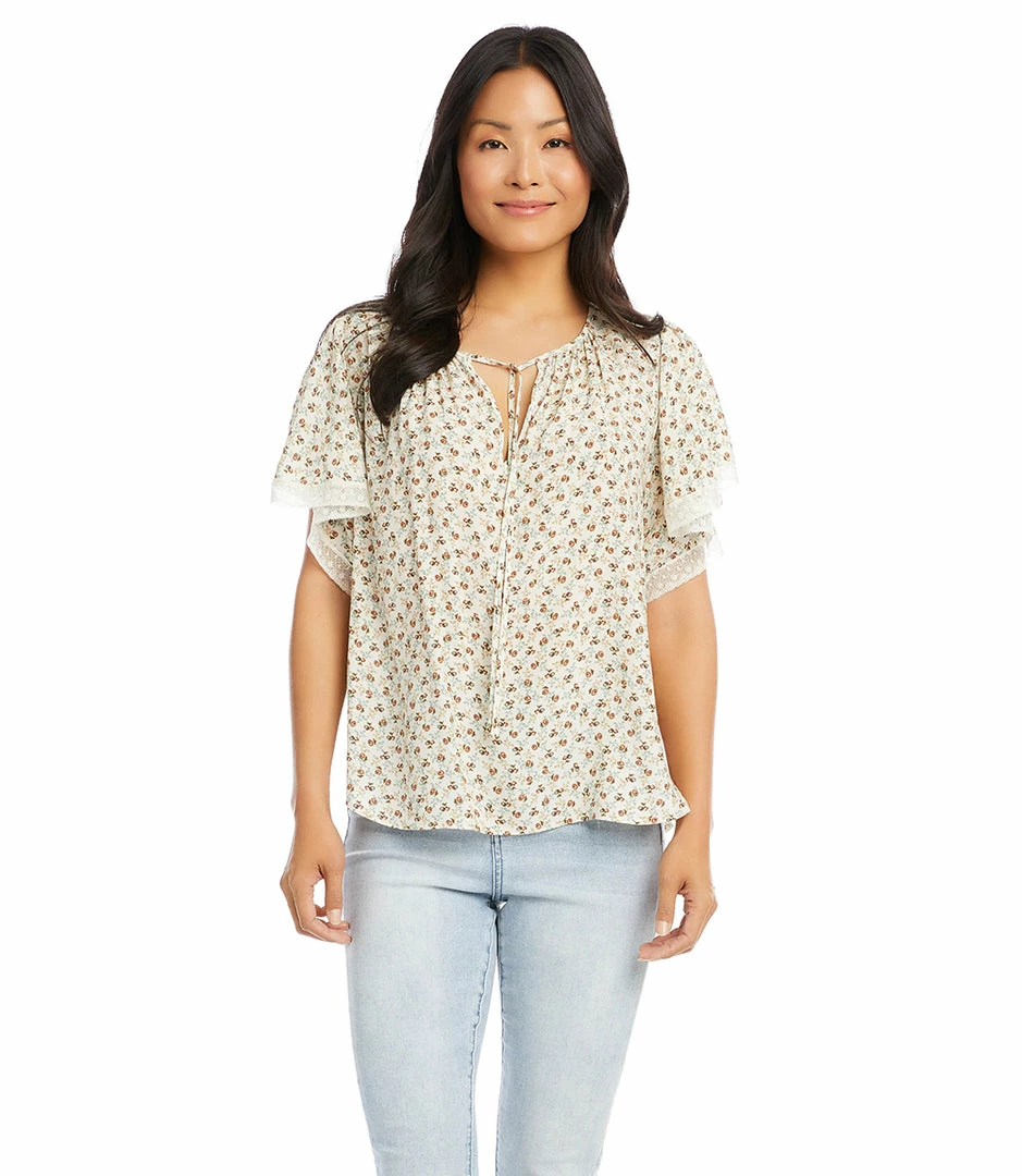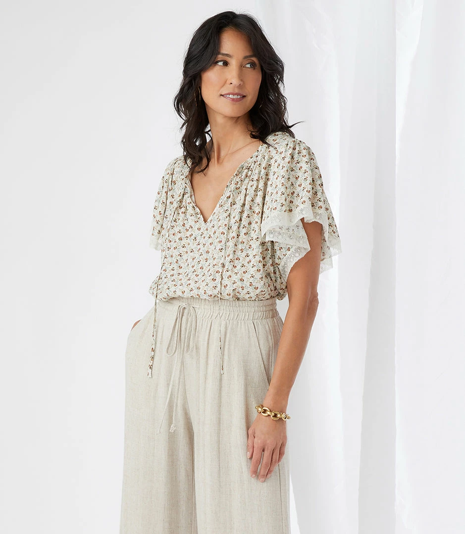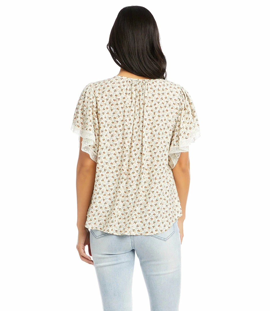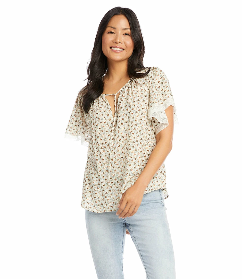 Flouncy flutter sleeves are detailed with delicate lace for romantic finish. This floral top is the epitome of bohemian charm.