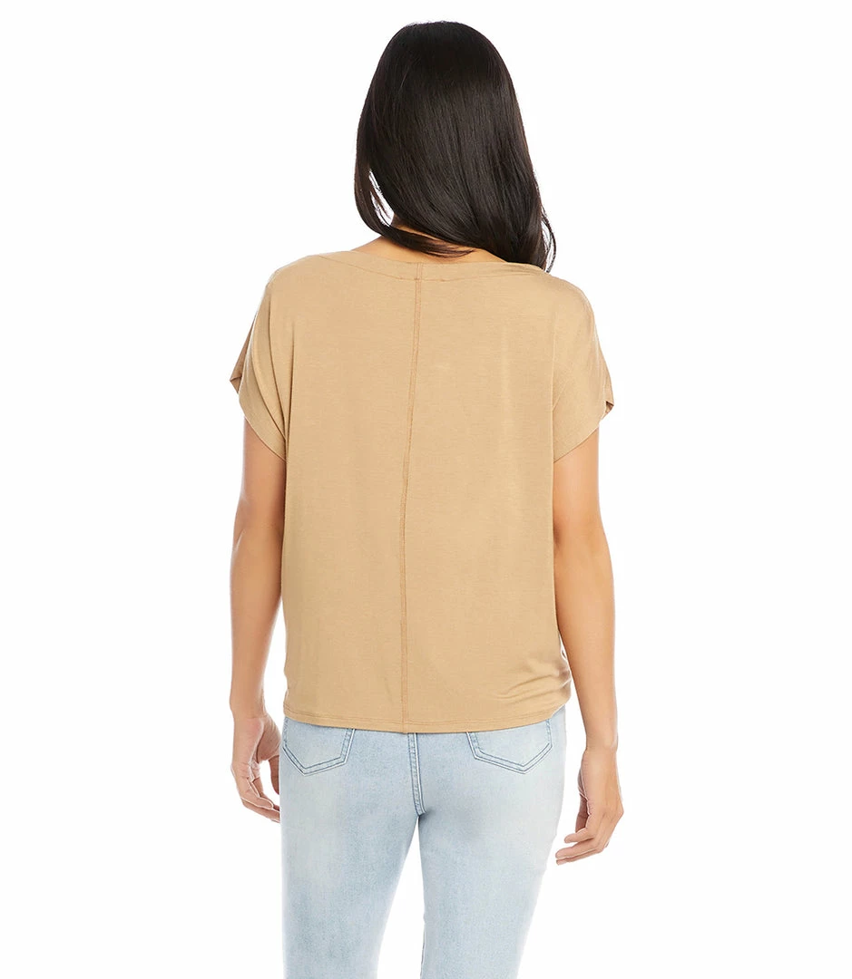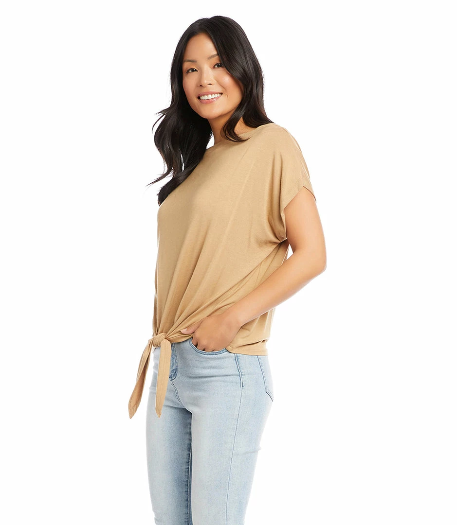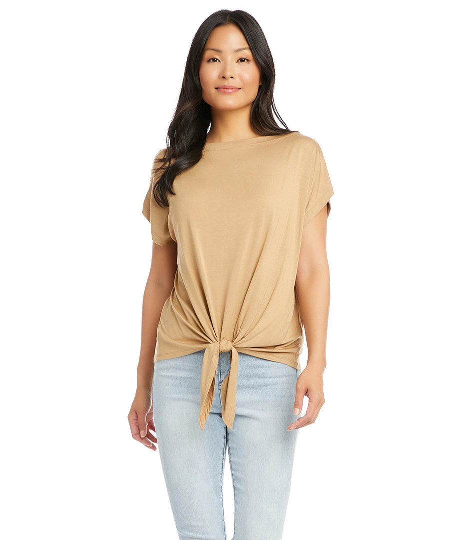 Cinched at the waist for a figure-flattering fit, this jersey-knit top features a sleek boat neckline, drop shoulder sleeves, and stylish tie-front.