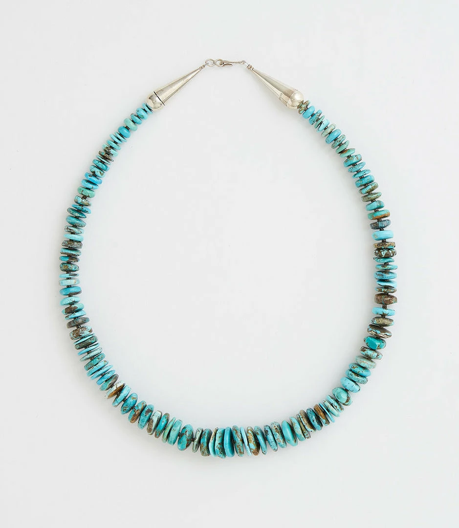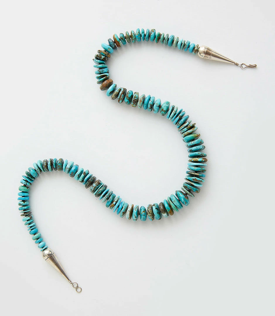Made by Navajo Artist Emma Singer, this beautifully crafted necklace is made of turquoise stones with hints of earthy tones.