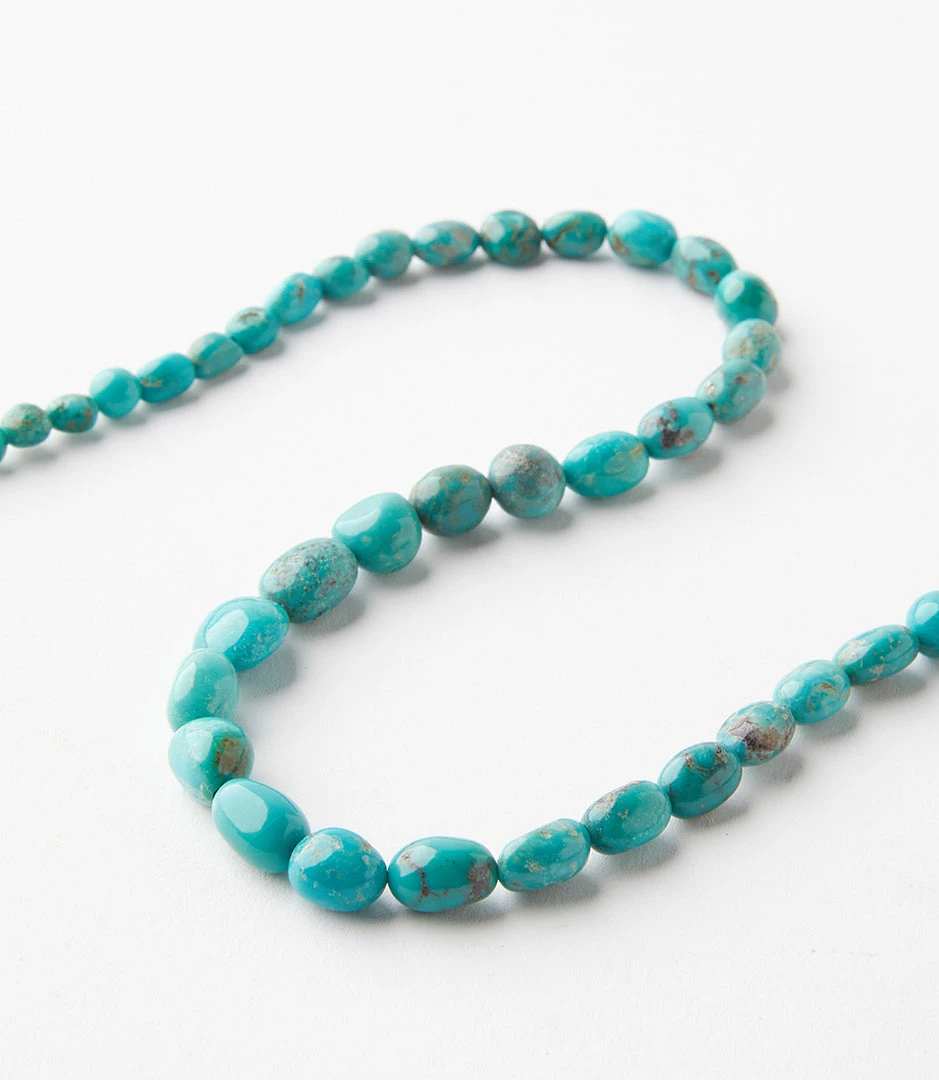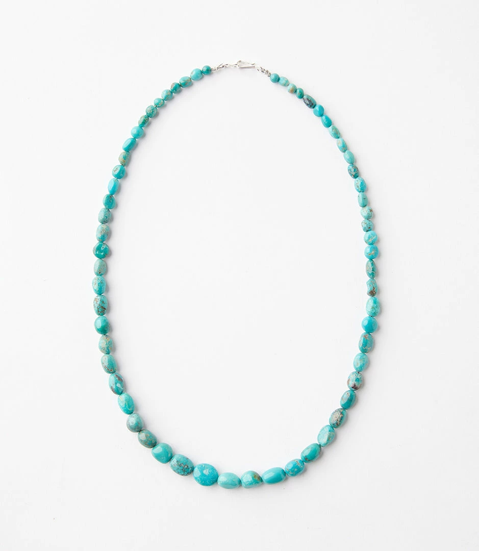Handcrafted by Native American artisans, this stunning necklace is made of a single strand of turquoise stones and is finished with a sterling silver hook and eye closure.