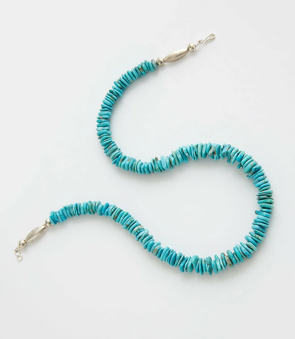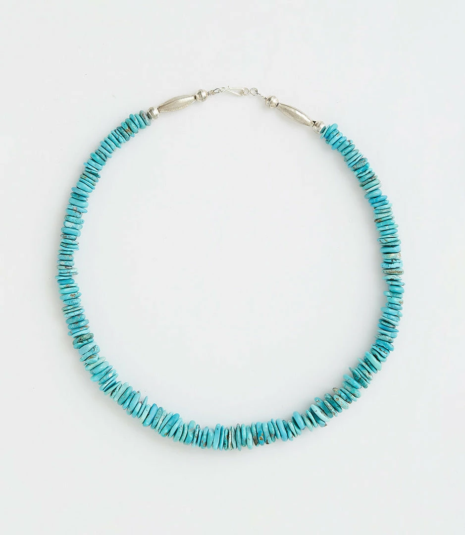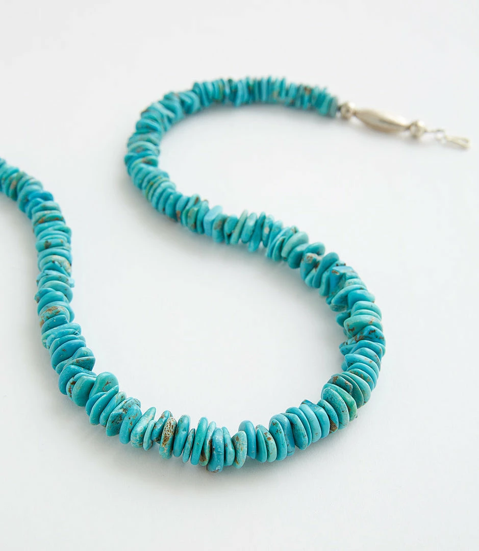 Made by a Navajo Artist, this beautifully crafted necklace is made of turquoise stones with hints of earthy tones.