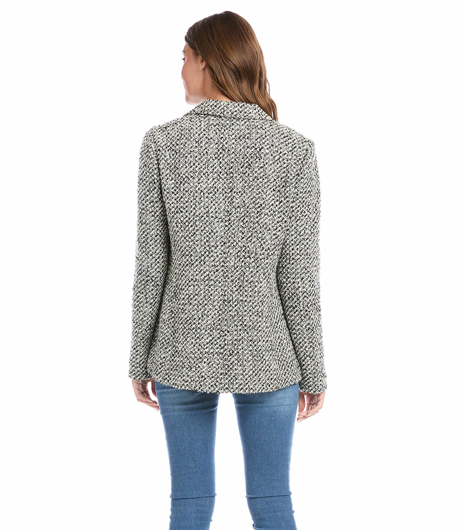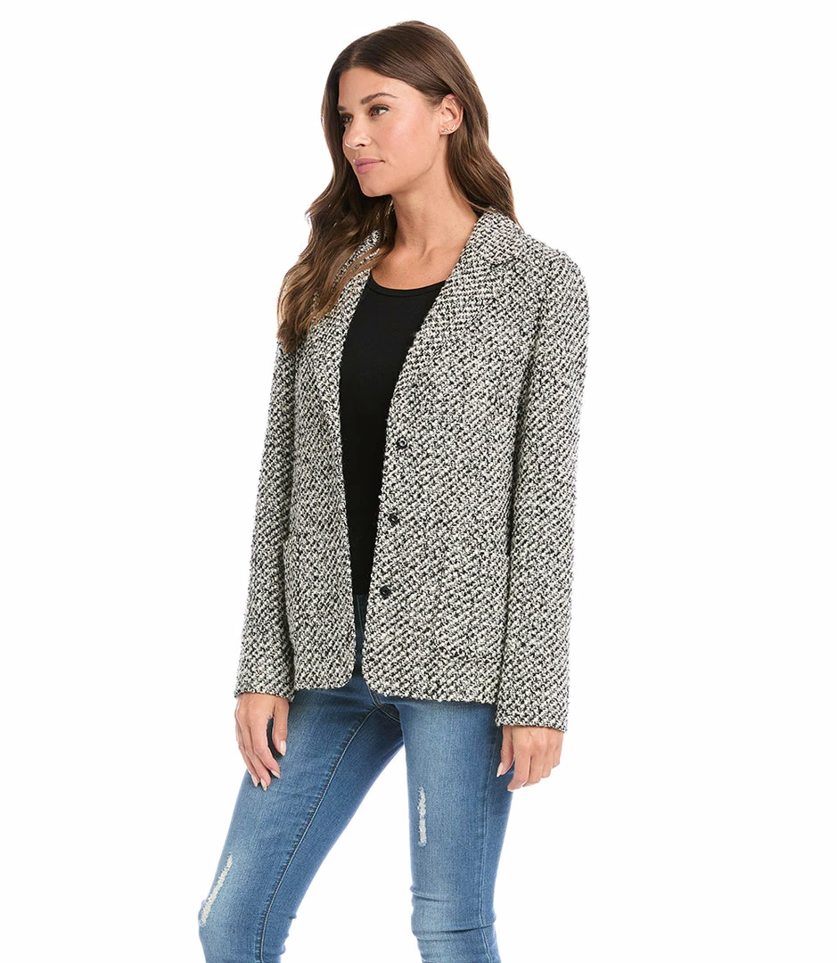 Richly textured yarns shape this polished tweed jacket. Tailored enough for the office or after hours. It also features handy patch pockets.