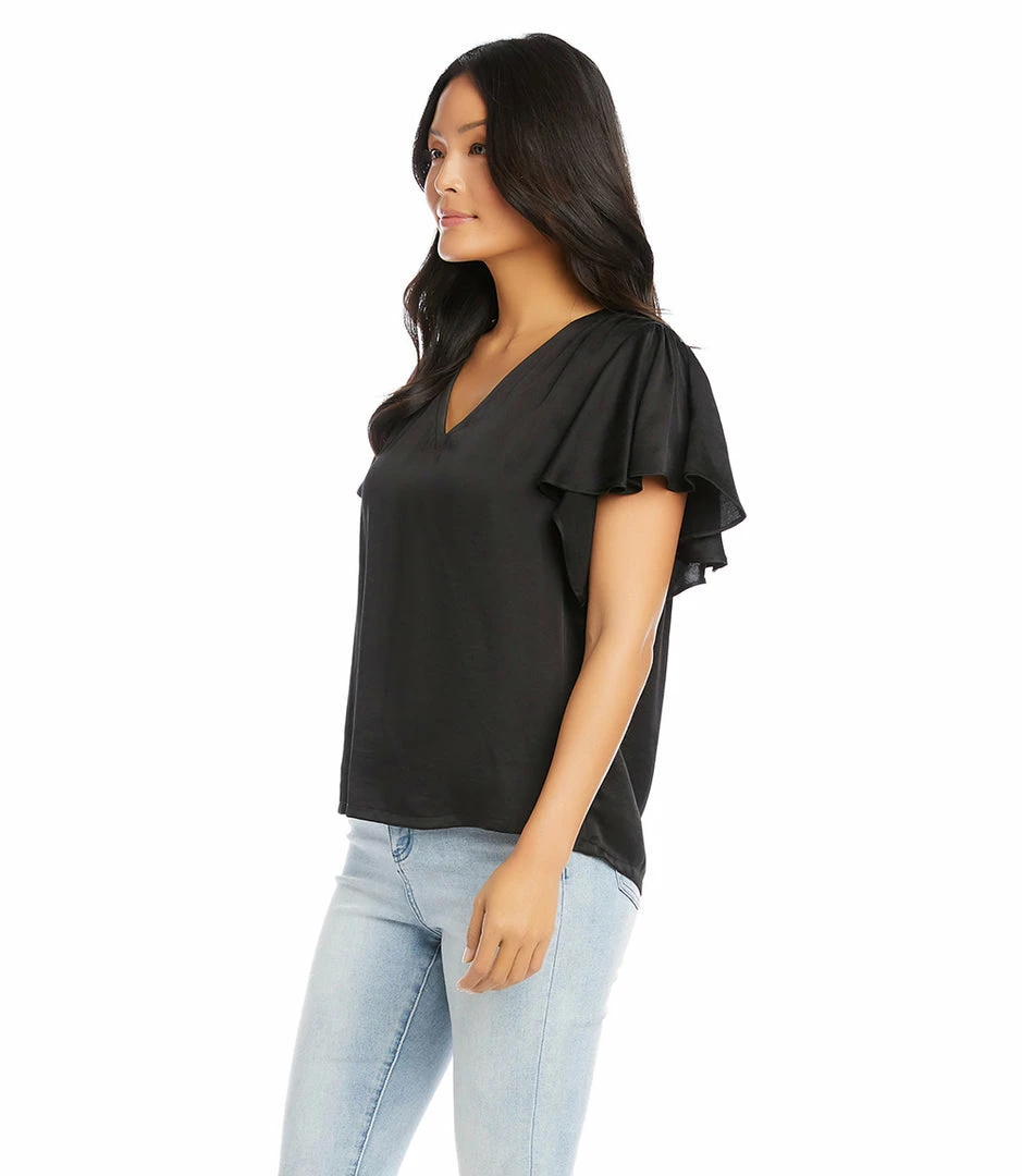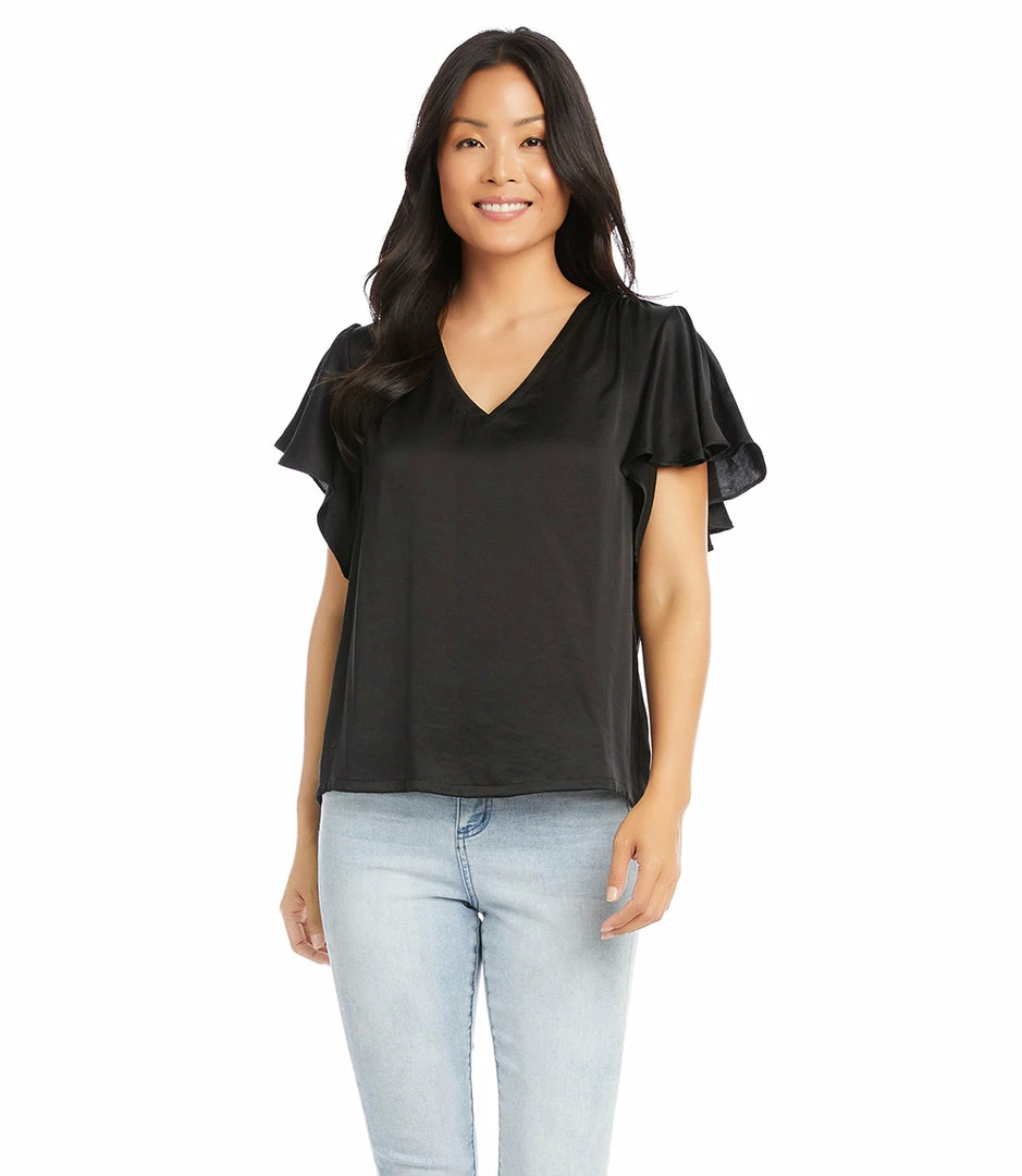 Cut from rich silky satin, this v-neck top is detailed with flouncy ruffle sleeves for soft feminine movement.