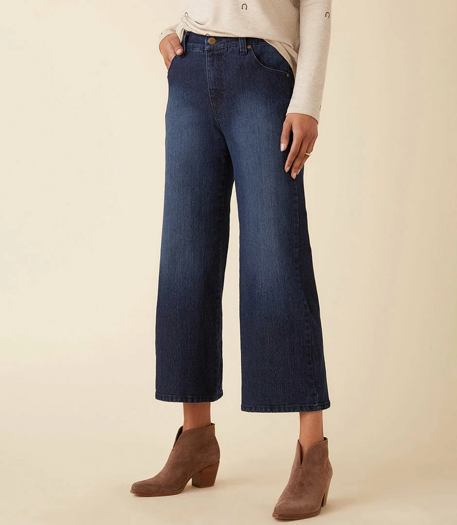 A dark denim wash creates these shapely stretch jeans detailed with a slimming mid-rise and stylish wide-leg silhouette.